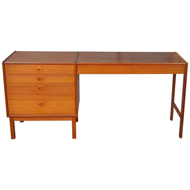 This totally clever Danish modern narrow teak dresser has an awesome clip on desk top that extends with two additional drawers. Although it looks like the brass hooks are the only support, there are two additional connecting plates that screw into the back of the desk and dresser for structural support. The dresser has four drawers (the top two are more slender), each with birch drawer frame construction and dovetail joins. Beautiful condition with a lovely patina and most unique, is the narrow depth at only 15″ deep – making it perfect for smaller spaces without forfeiting the length – it would even double perfectly as a vanity with a mirror hung above it. Disassembles for easy transport.