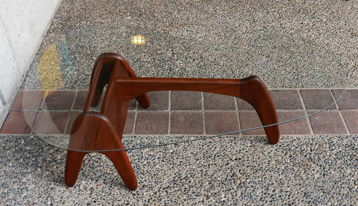 This fabulous Mid-Century Modern Atomic style solid walnut sculptural base coffee table was designed by Adrian Pearsall in the 1960s. Featuring a kidney shaped glass top. In fantastic condition – the base has been restored and the glass is in excellent original condition.