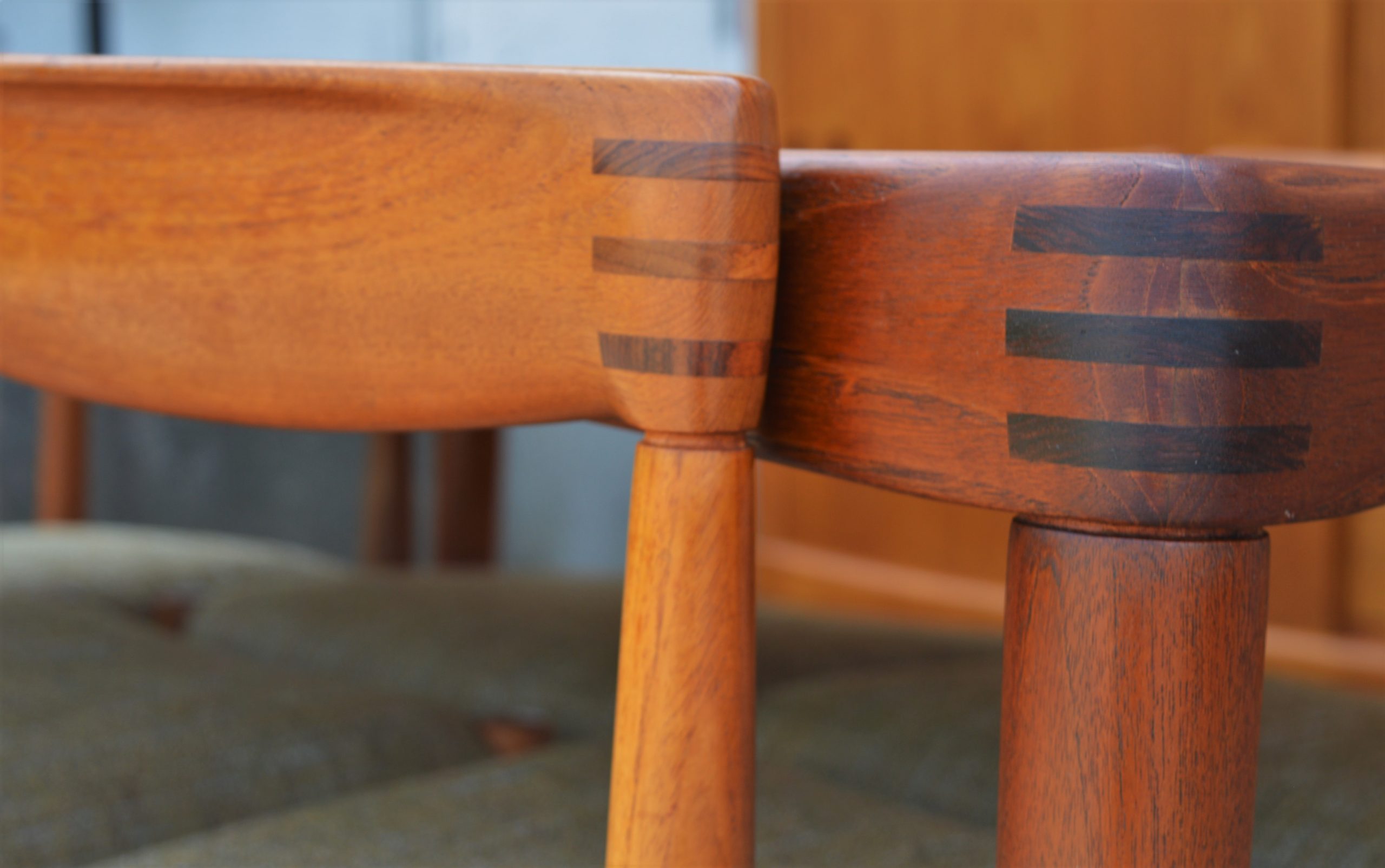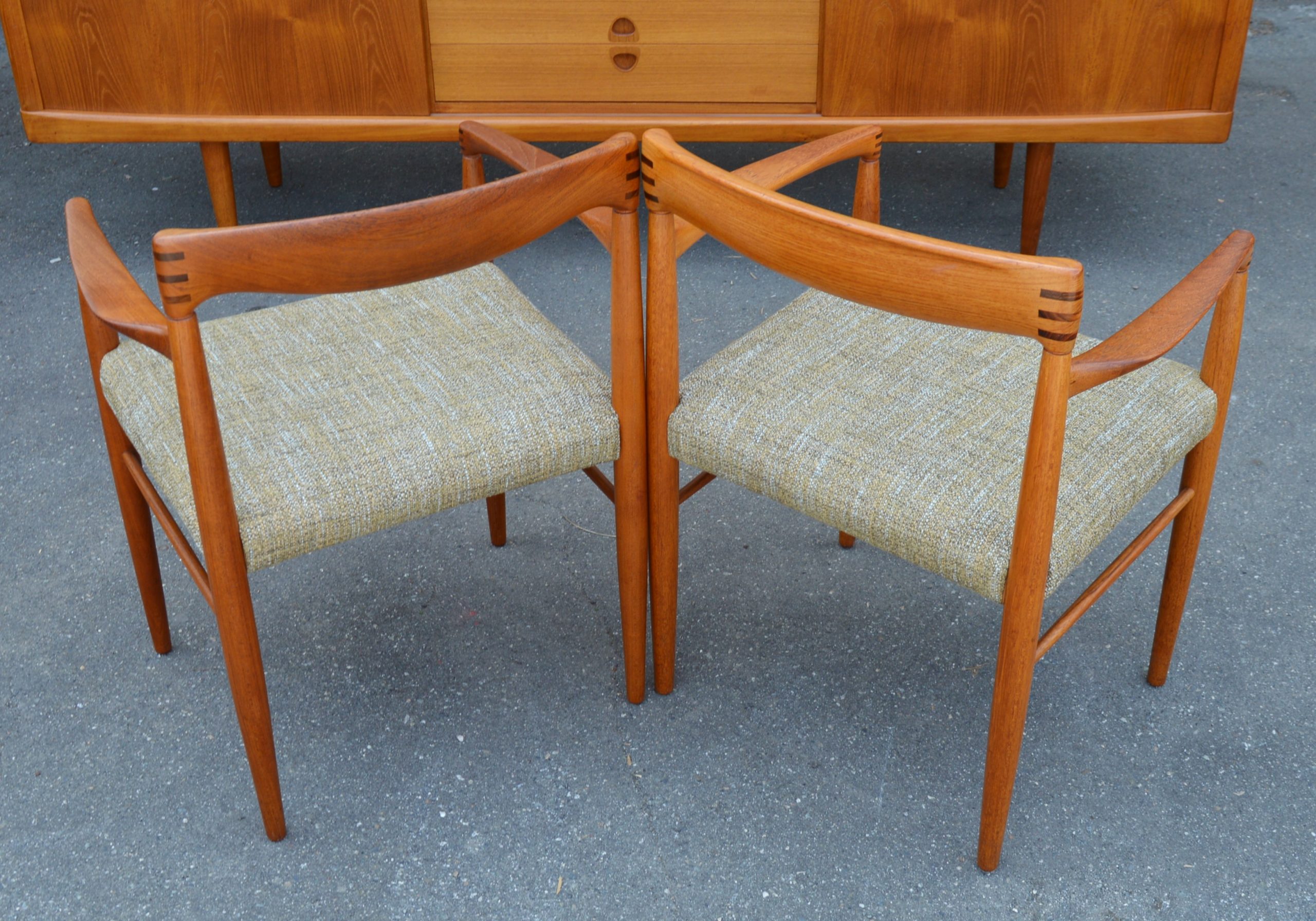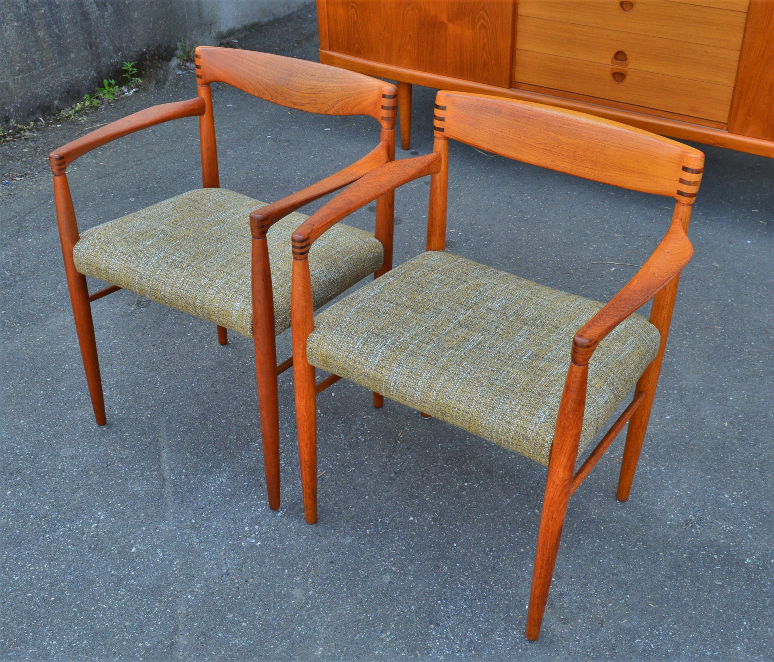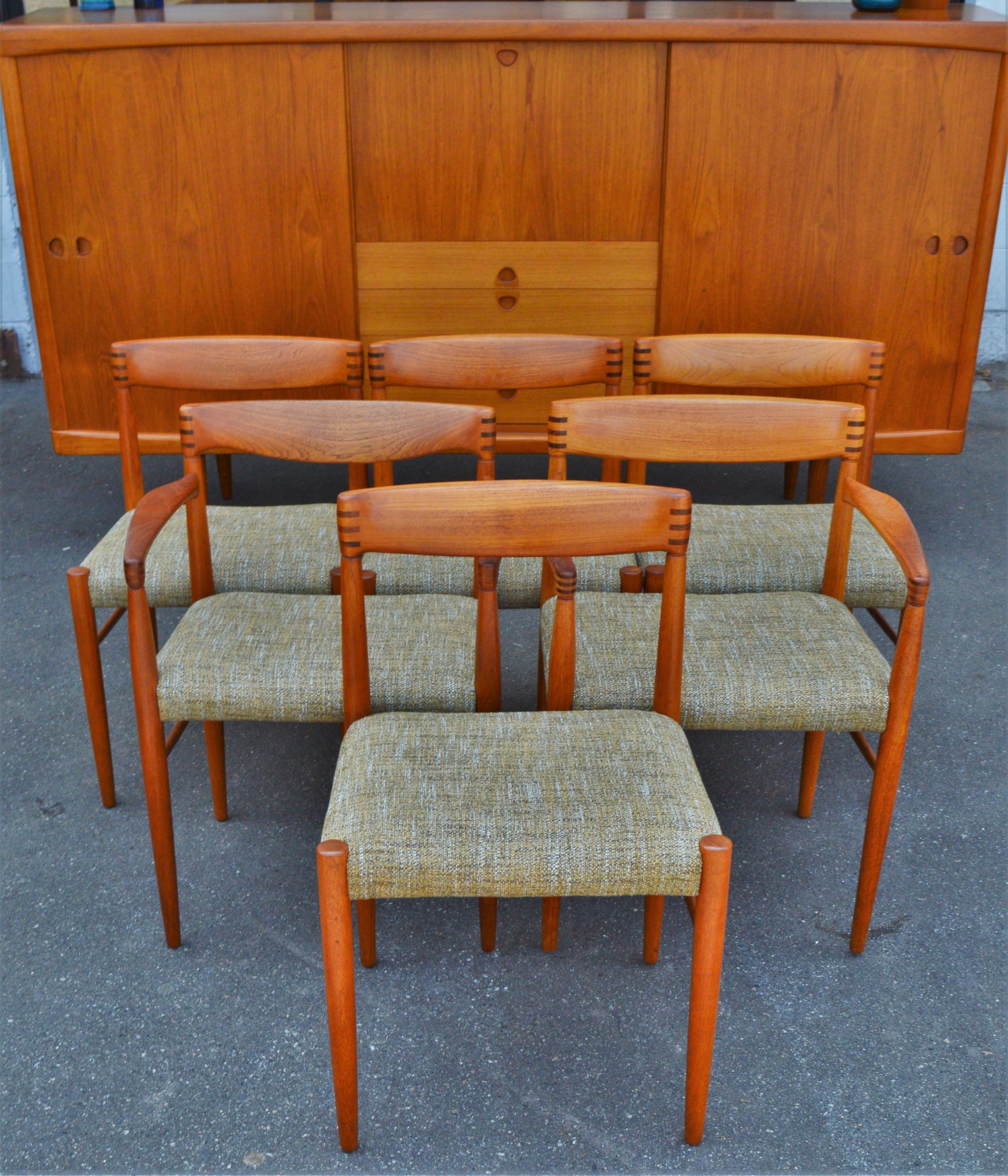 The amazing set of 6 quality built teak dining chairs were also designed by H.W. Klein for Bramin in the 1960s and were designed to go with the dining table, and includes two rare arm chairs. They feature the amazing rosewood finger joint details at the corners of the sculptural backrests as well as on the front of the armrests on the pair of head chairs. In amazing condition, freshly oiled, reglued as needed, and reupholstered with new foam and a lovely multi-toned green tweed. Please note that one of the arm chairs is a slightly different model without the flared top at the back of the backrest. We bought them this way and never even noticed until I photographed them today. PLEASE NOTE: as is our policy, we have already deducted 10% off the cost of the chairs as they are sold with the dining table.