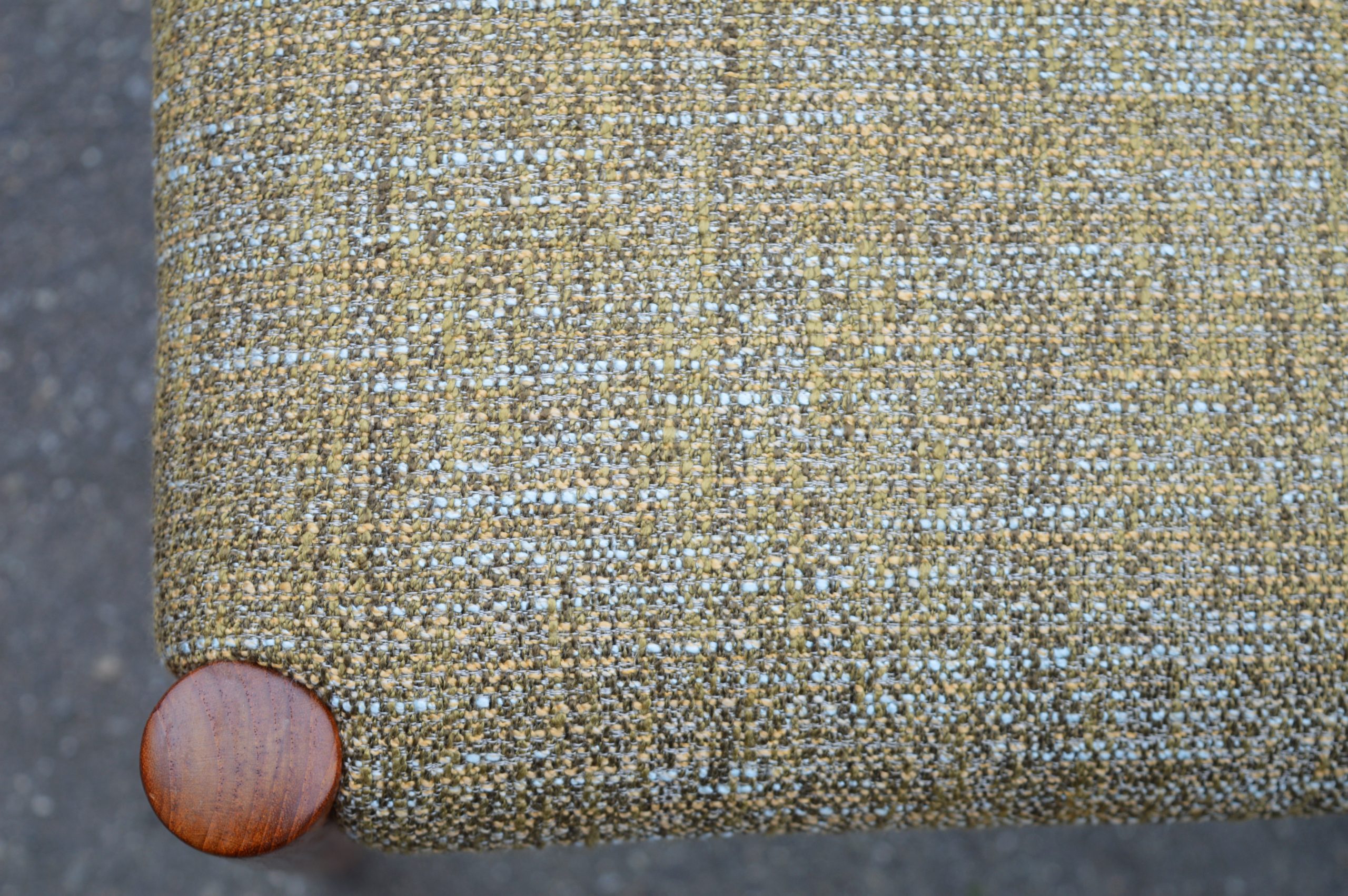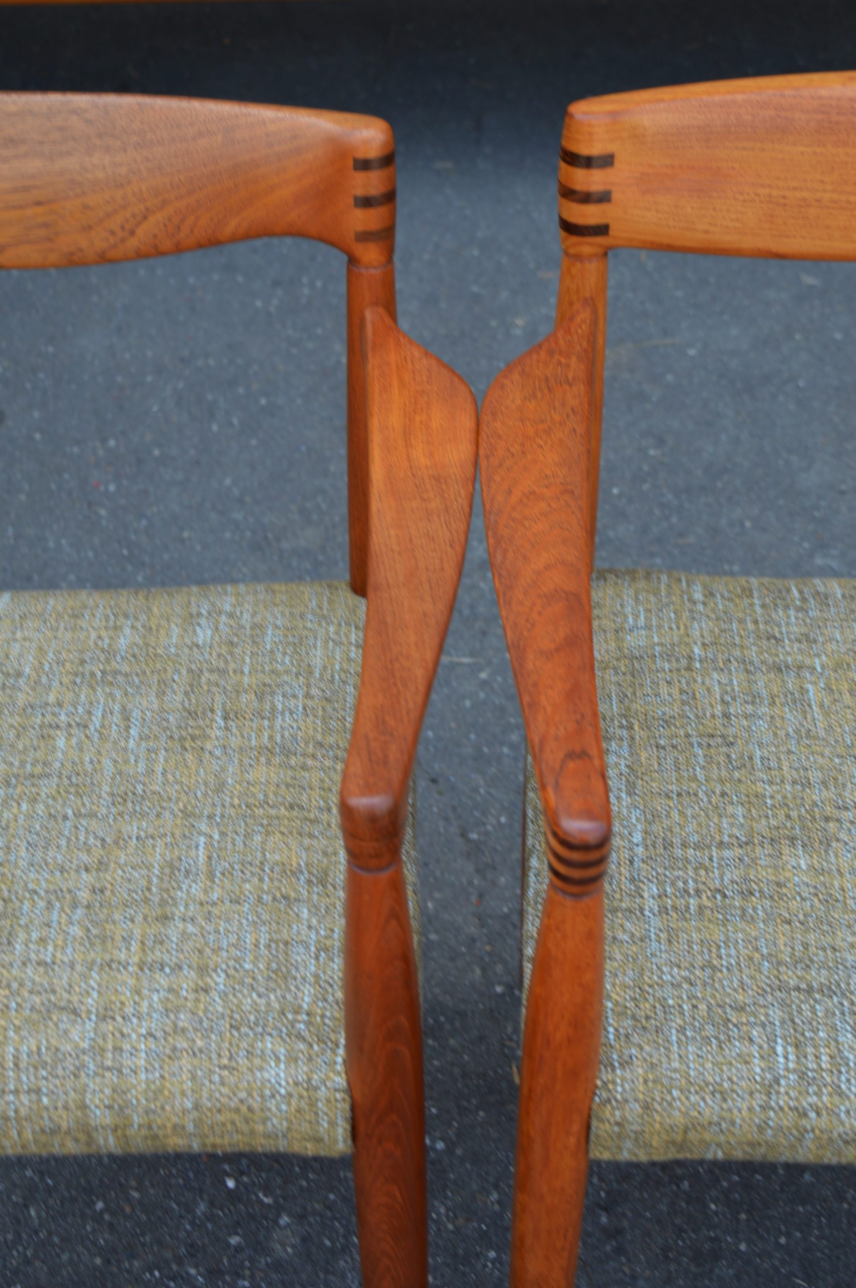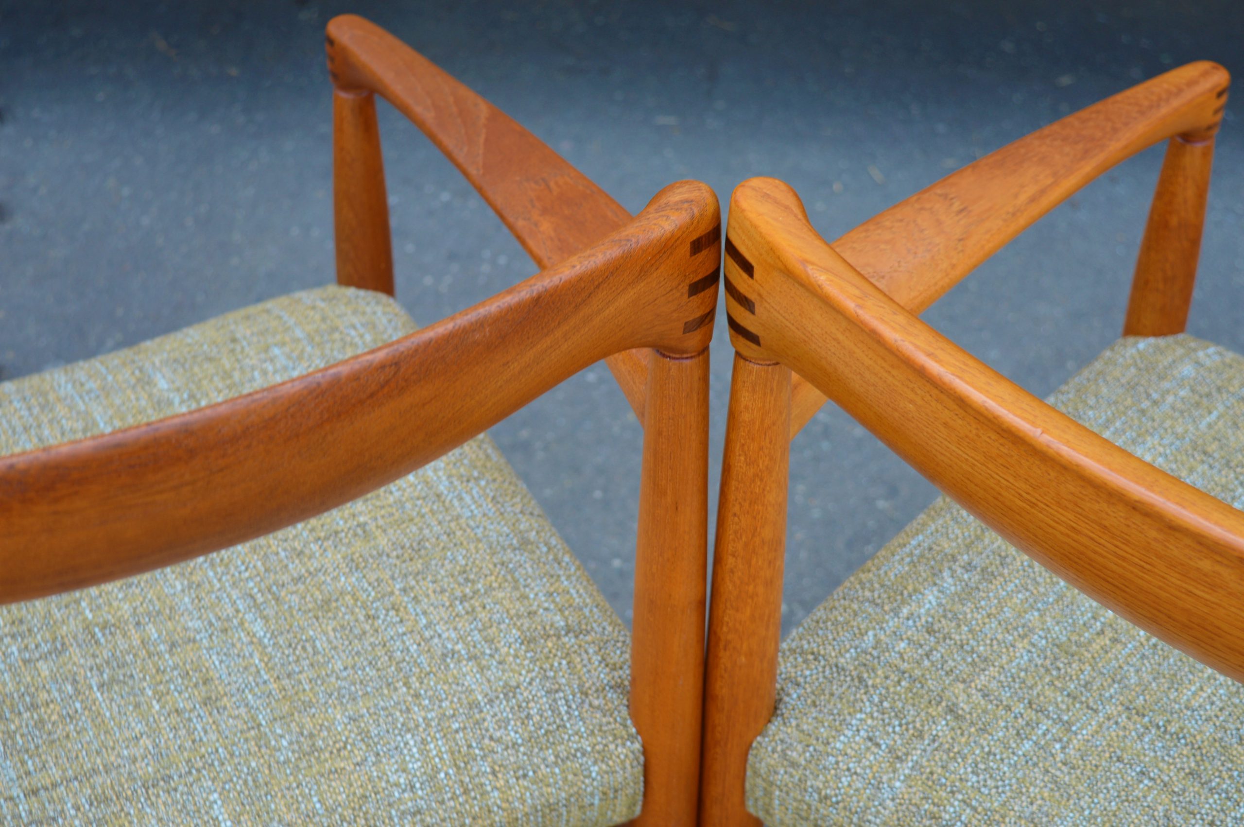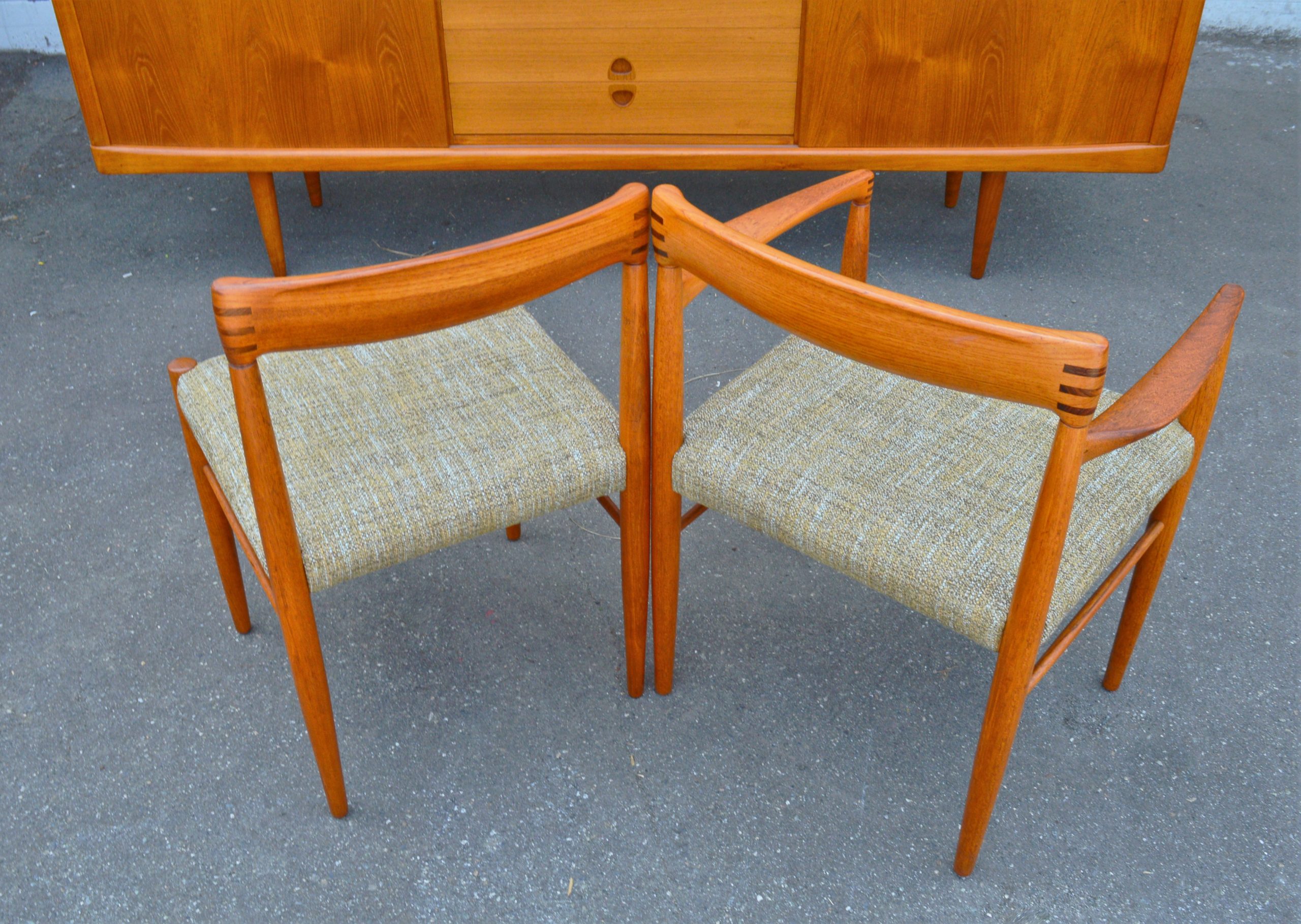 The amazing set of 6 quality built teak dining chairs were also designed by H.W. Klein for Bramin in the 1960s and were designed to go with the dining table, and includes two rare arm chairs. They feature the amazing rosewood finger joint details at the corners of the sculptural backrests as well as on the front of the armrests on the pair of head chairs. In amazing condition, freshly oiled, reglued as needed, and reupholstered with new foam and a lovely multi-toned green tweed. Please note that one of the arm chairs is a slightly different model without the flared top at the back of the backrest. We bought them this way and never even noticed until I photographed them today. PLEASE NOTE: as is our policy, we have already deducted 10% off the cost of the chairs as they are sold with the dining table.