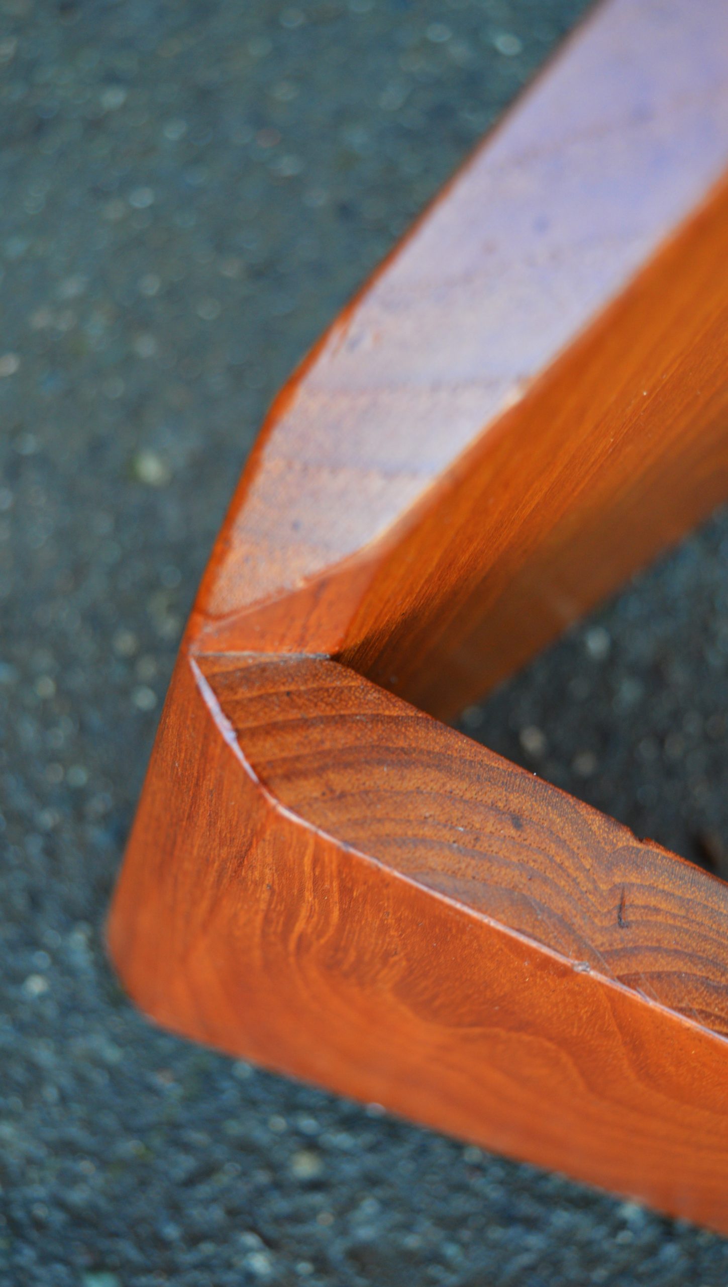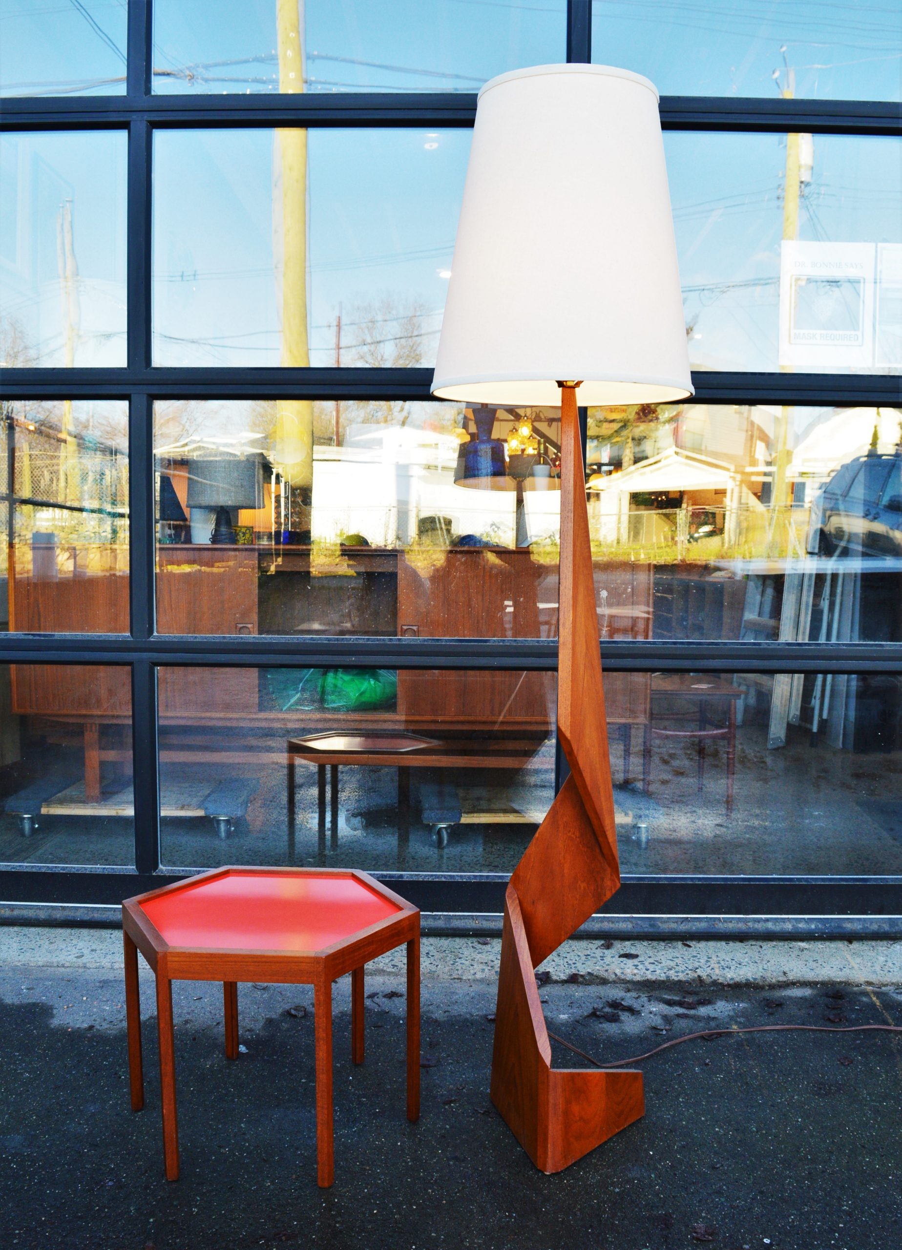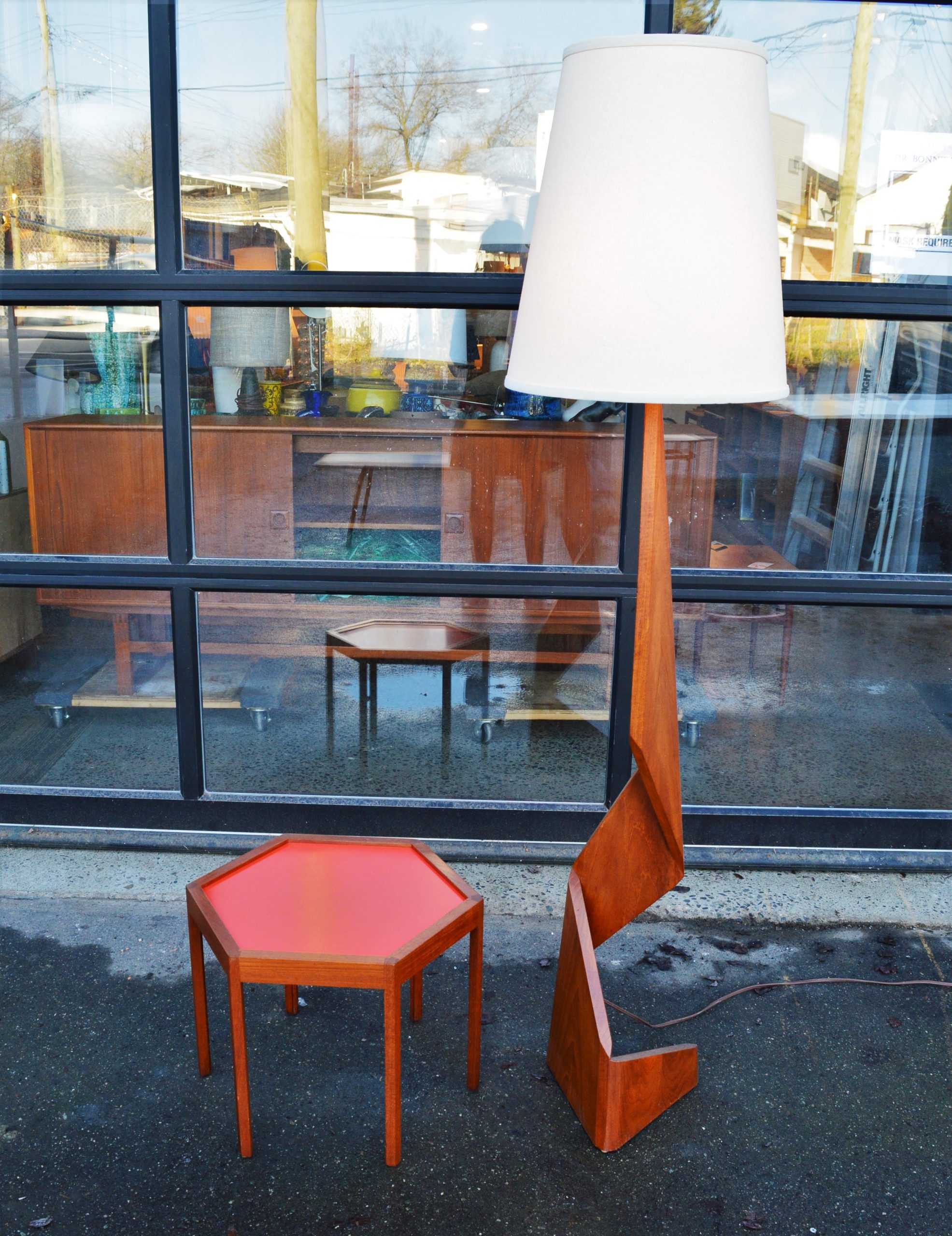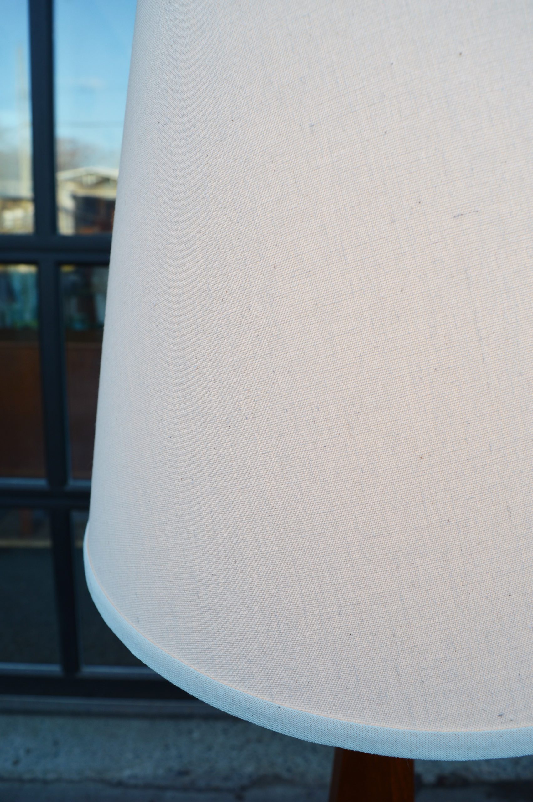 This totally iconic and rare Danish Modern solid teak floor lamp is made up of diamonded segments of solid teak (note the bevelled edges) that angle upward creating amazing angles and lines. There are many orientations you can place it in – more solid or more minimalist – to your taste. In excellent condition and freshly oiled and this one we paired with a Lotte Bostlund inspired new linen conical shade. Uses a three way / trilight regular base light bulb and wired for North American standards with a two prong plug. Dimensions: 15″ diameter x 64.25″H.