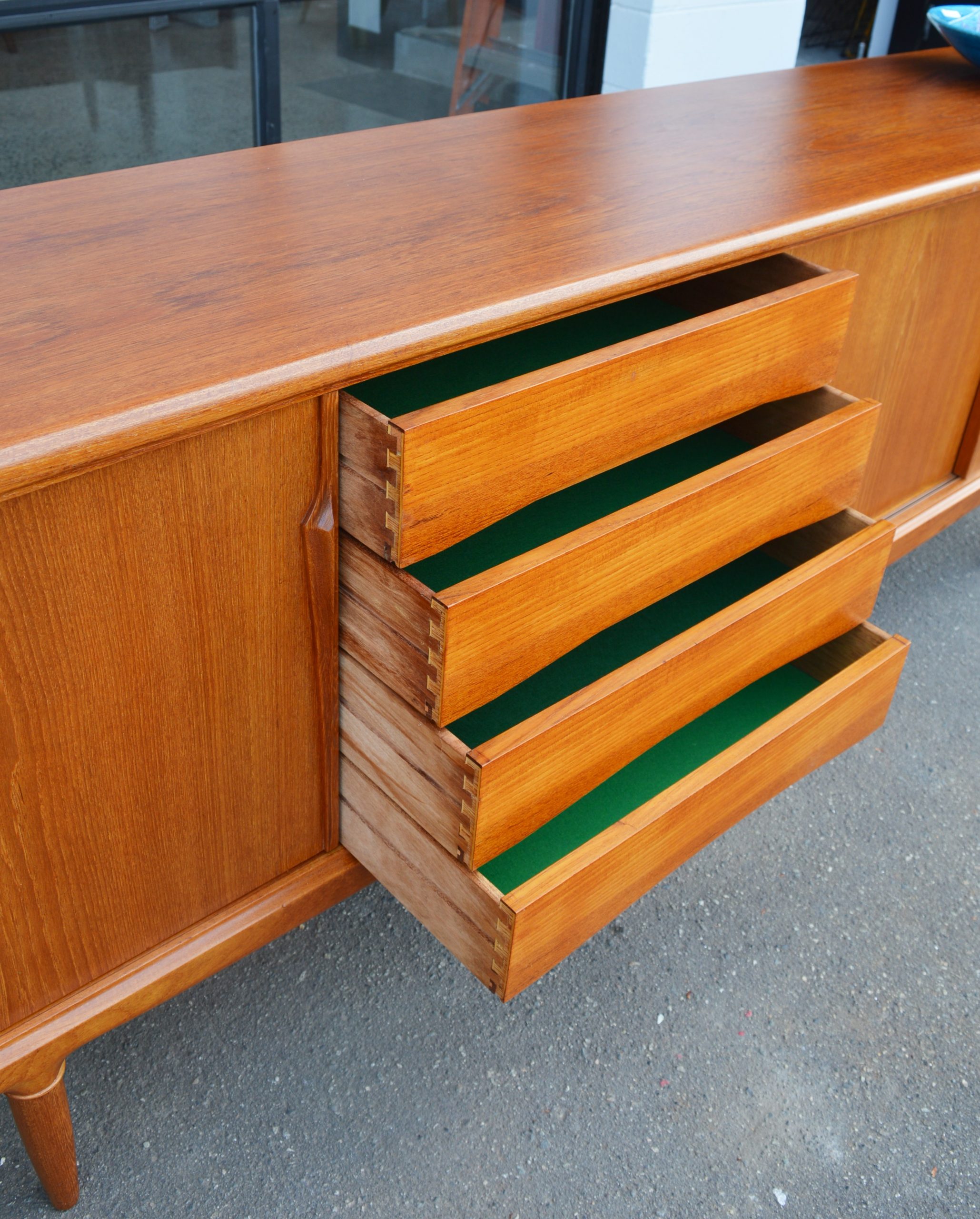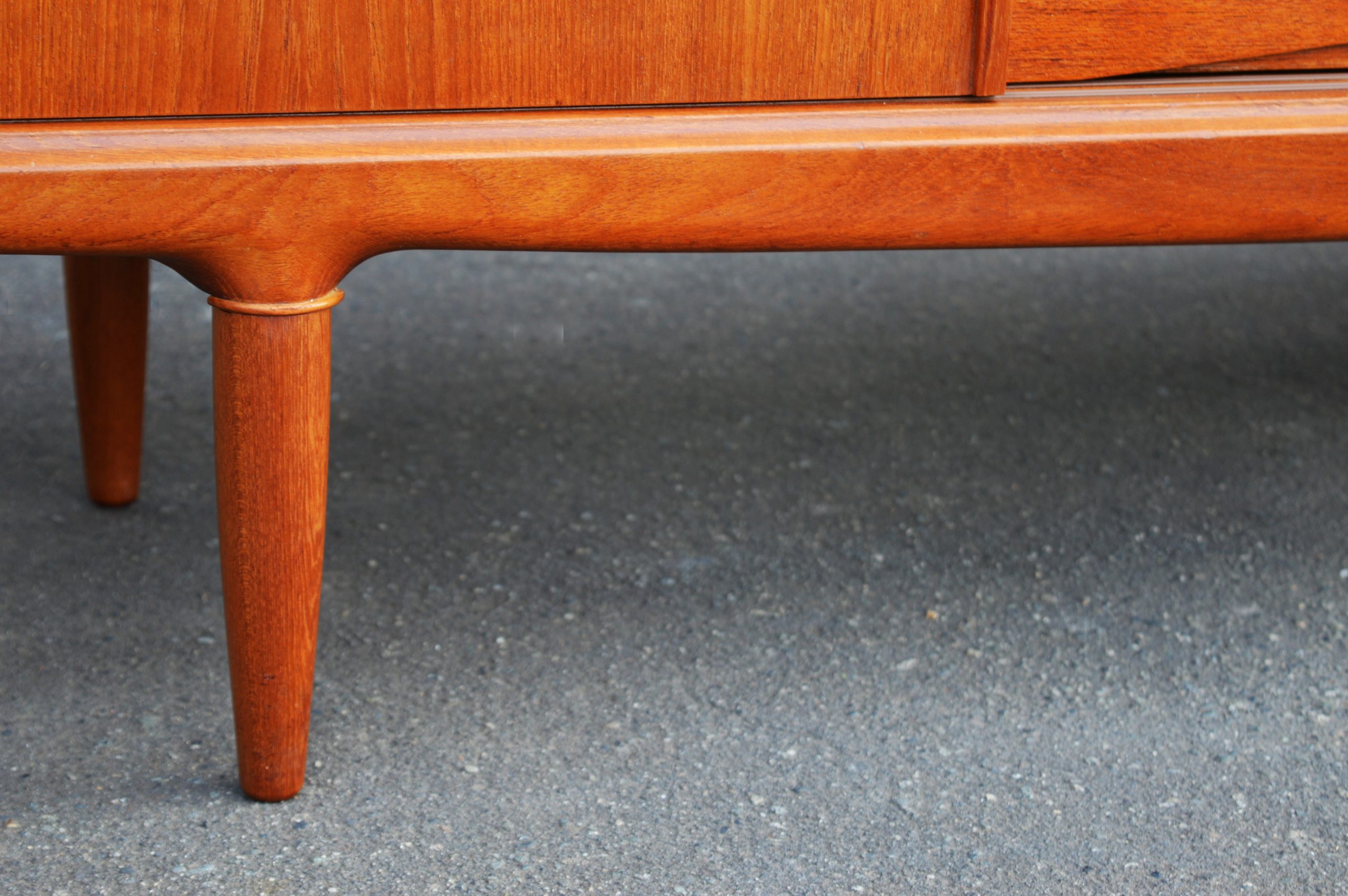 This exquisite example of the longest version of this credenza – designed by Gunni Omann in the 1960s for Axel Christensen Odder (ACO Mobler).  The sculptural elements throughout this piece are exceptional.  Note the arced front/side molding details, the lower molding flares towards the middle and tapers at the ends, the small ring around the top of the legs before they contour into the base apron.  Also to note, are the 2 gorgeous styles of sultry door pulls and the arced cut-away at the bottom of the bank of 4 drawers.  This lovely is all wood construction with wood drawer frame construction with dovetail joints and is in gorgeous condition with a mid-tone.  The left door conceals one adjustable shelf, the two right doors conceal one long adjustable shelf, the back is finished and branded with the makers mark, and the drawers are all felted!  Phew!  So many amazing details to include!  Dimensions:  94.5″W x 18.5″D x 32″H.