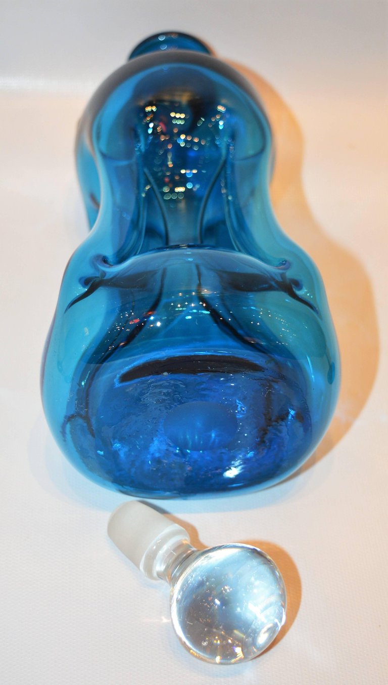 This iconic Danish handblown glass decanter was designed by Michael Bang for Holmegaard in the 1960s. Called the Gluk Gluk decanter, due to the four air channels through which the liquid passes as you pour, making a charming gurgling sound. It retains the original sticker and a clear glass stopper. We have paired it with four cordial glasses also by Holmegaard. All are in a gorgeous shade of blue and are in excellent condition with no chips or cracks. Made in Denmark.