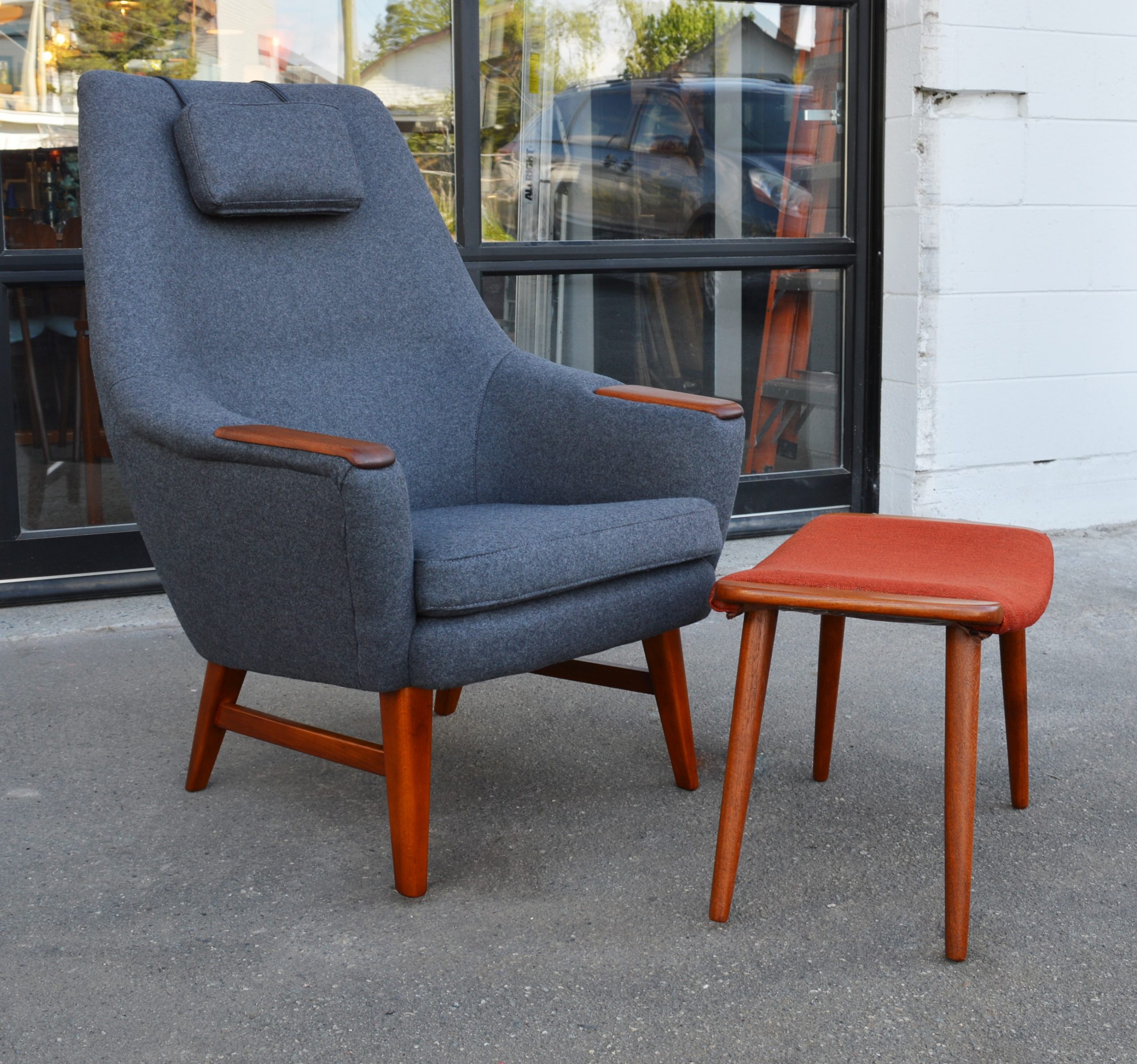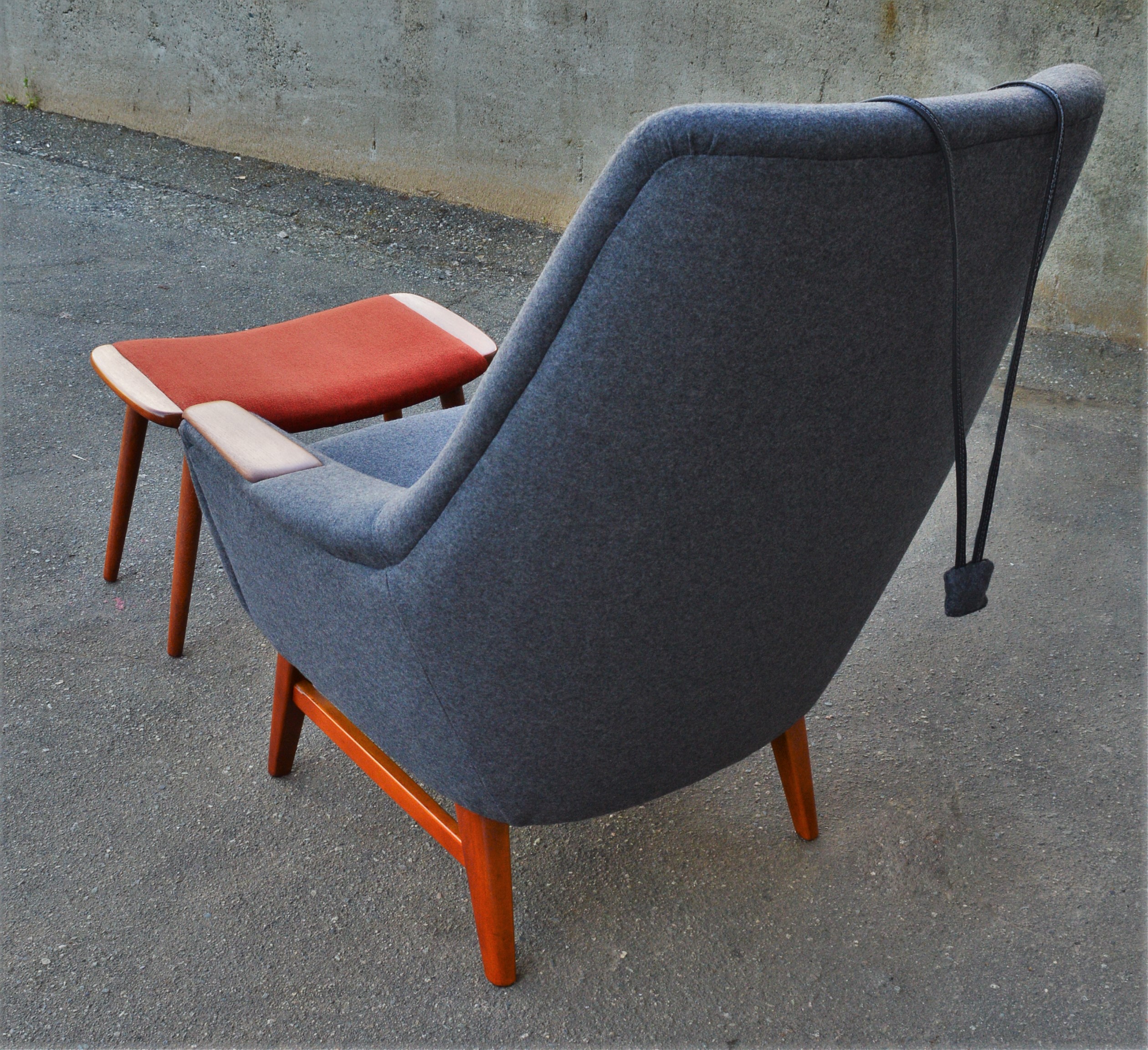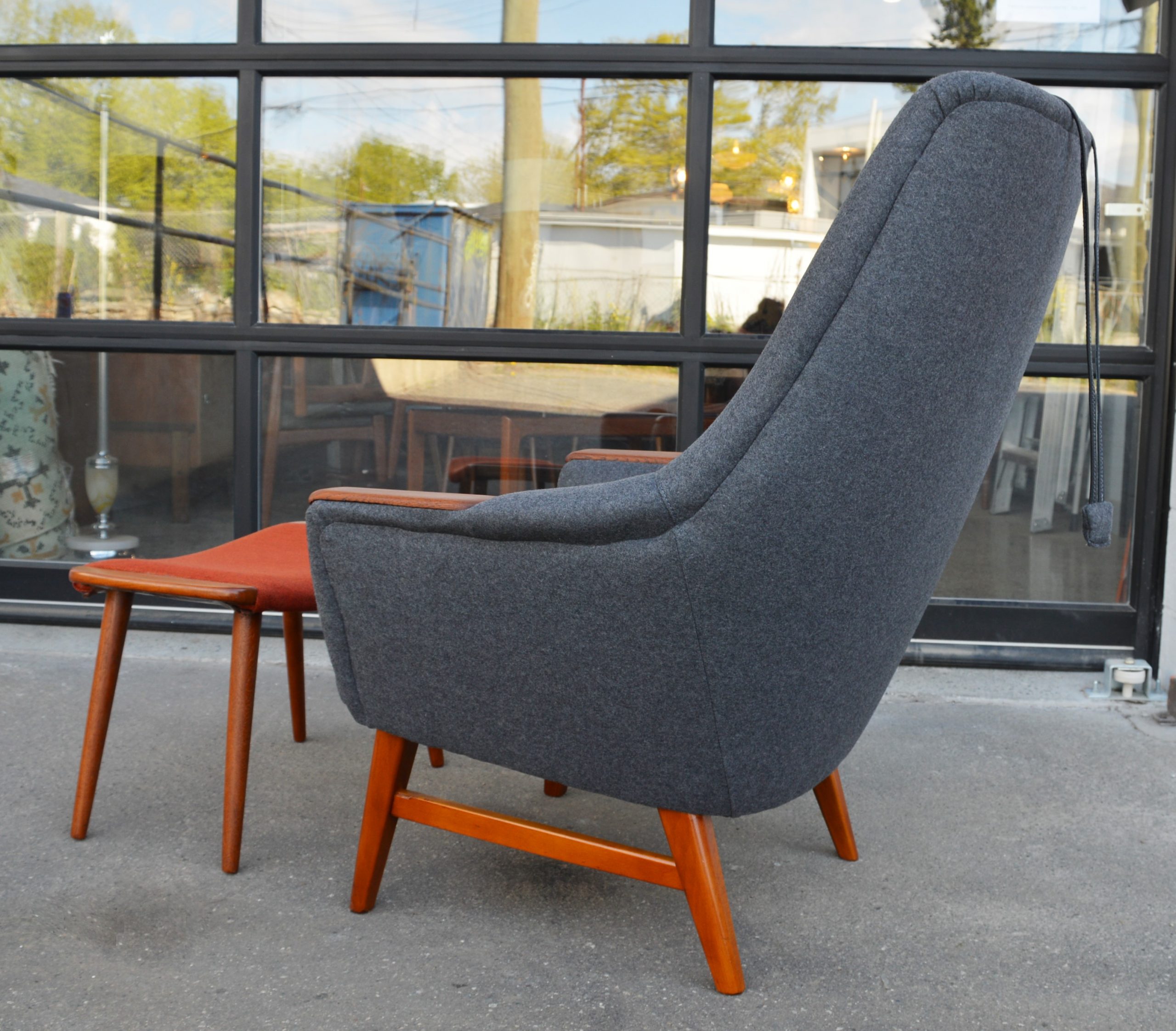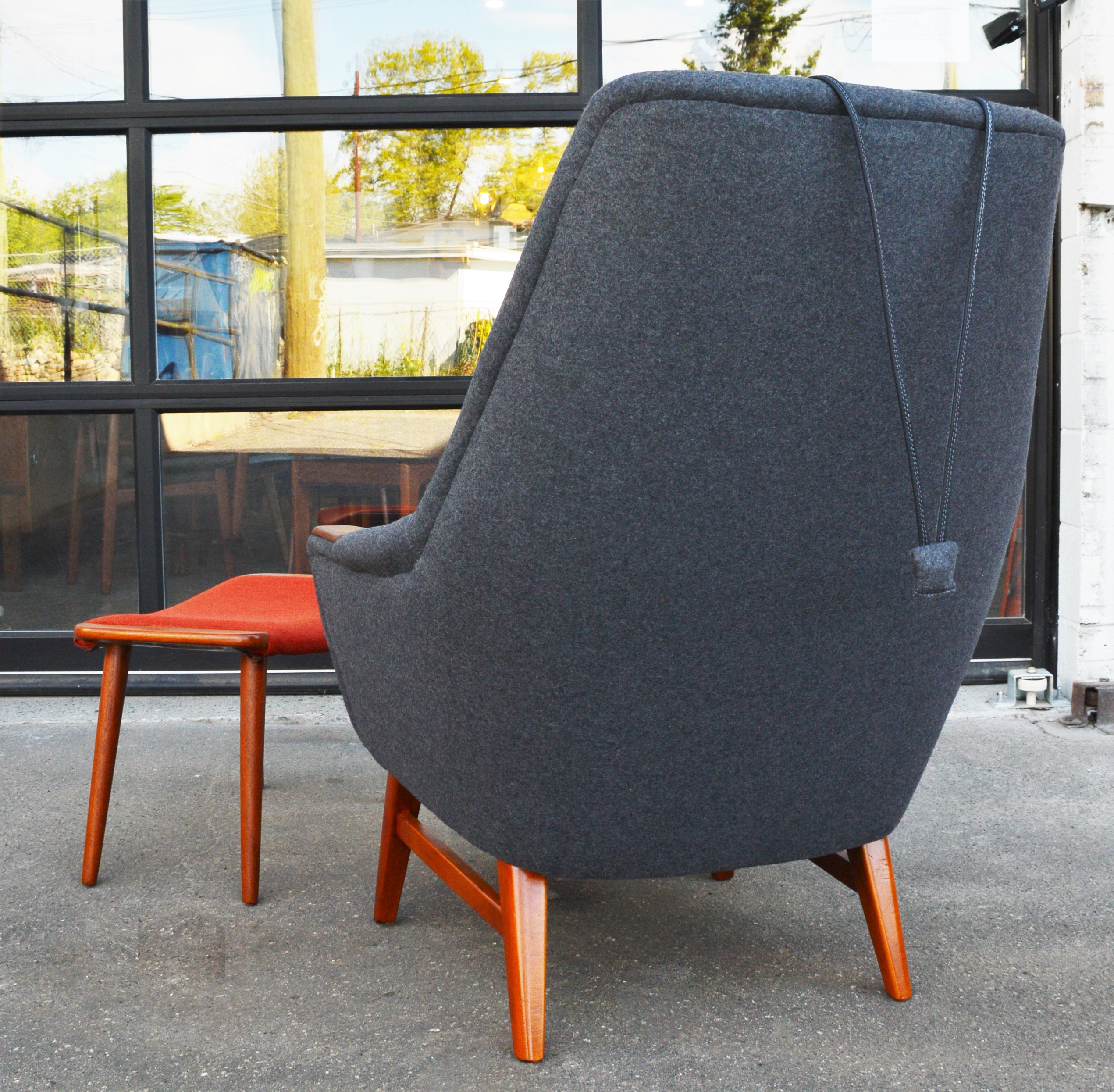 Norwegian Highback Teak Arm/Base Charcoal Wool Lounge Chair & Ottoman