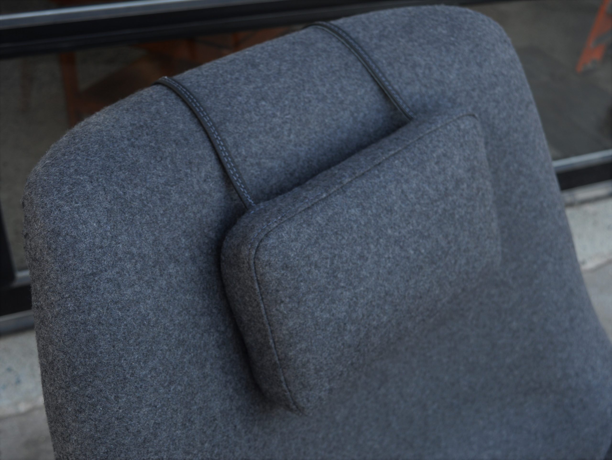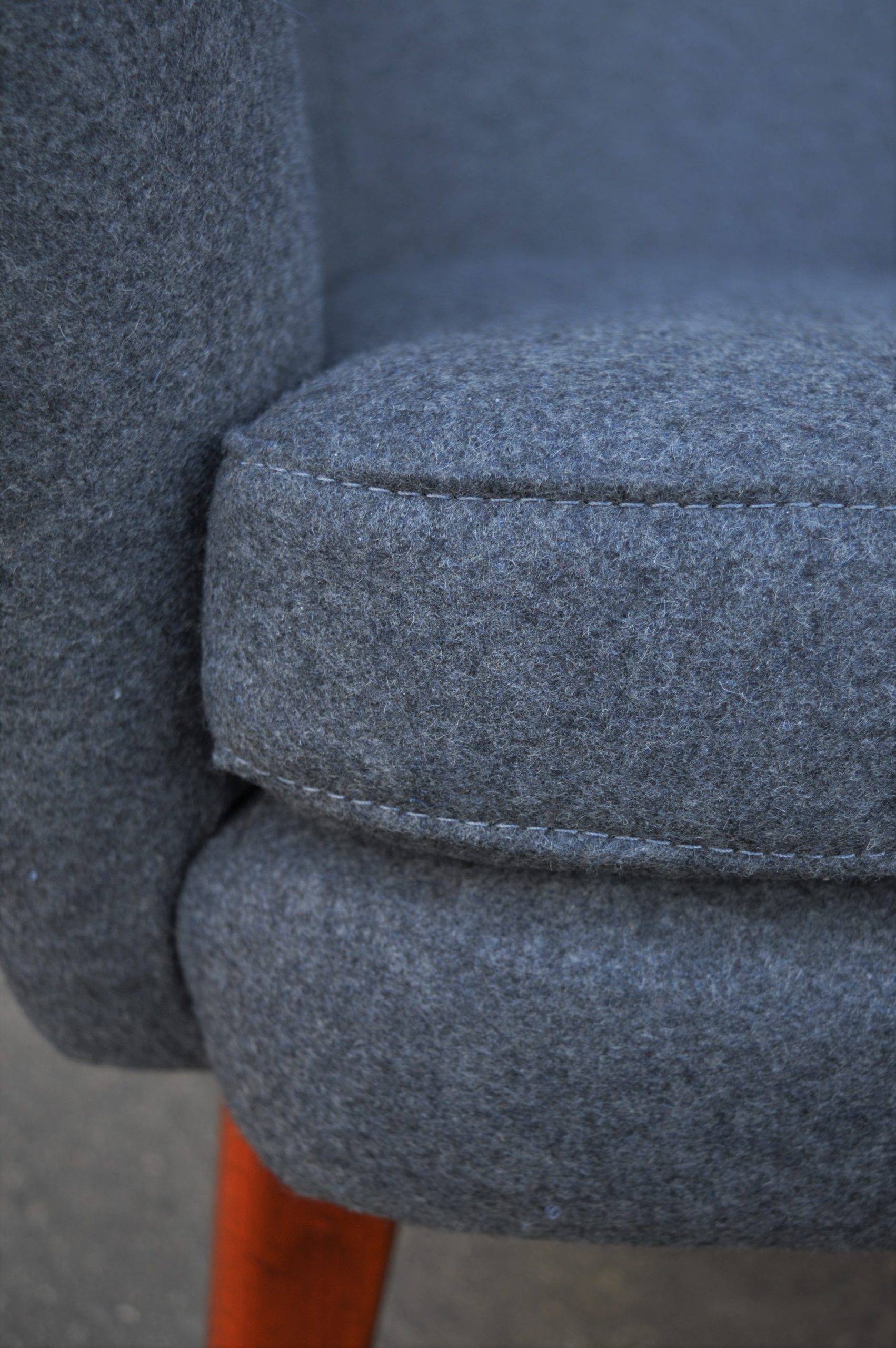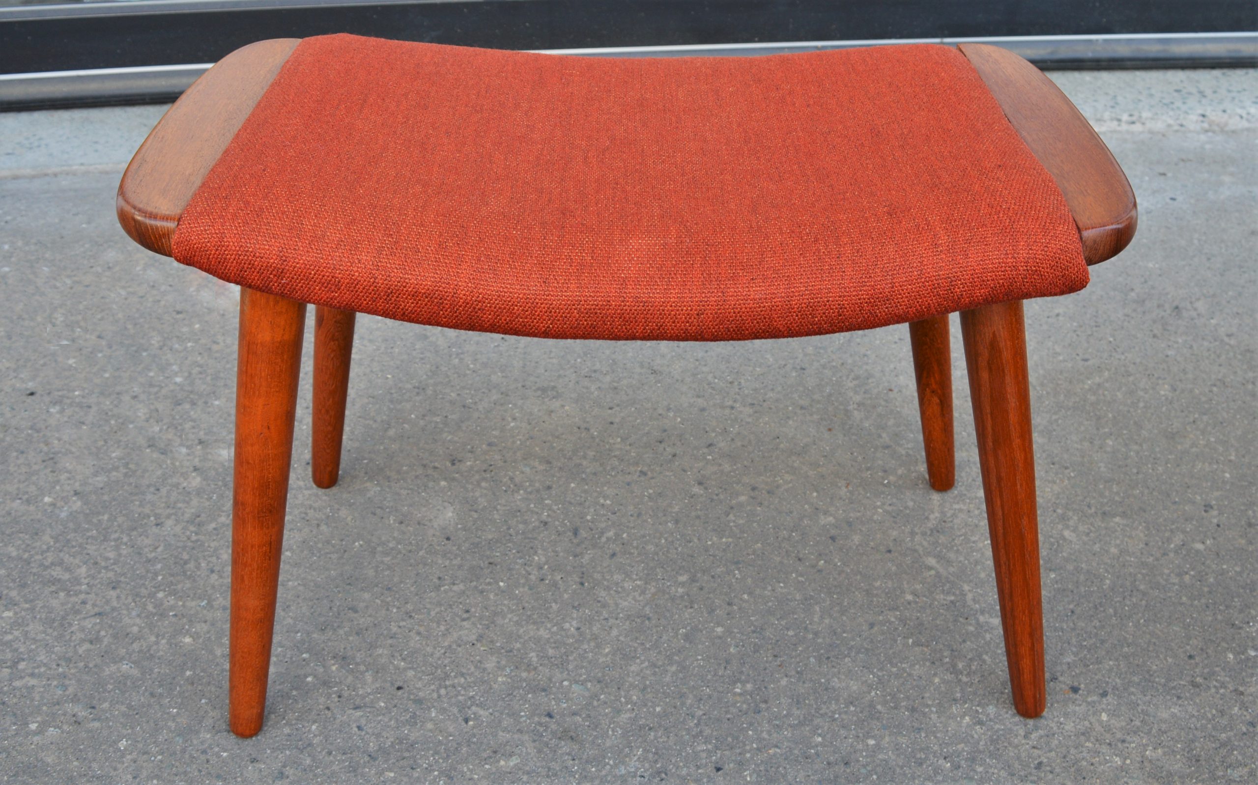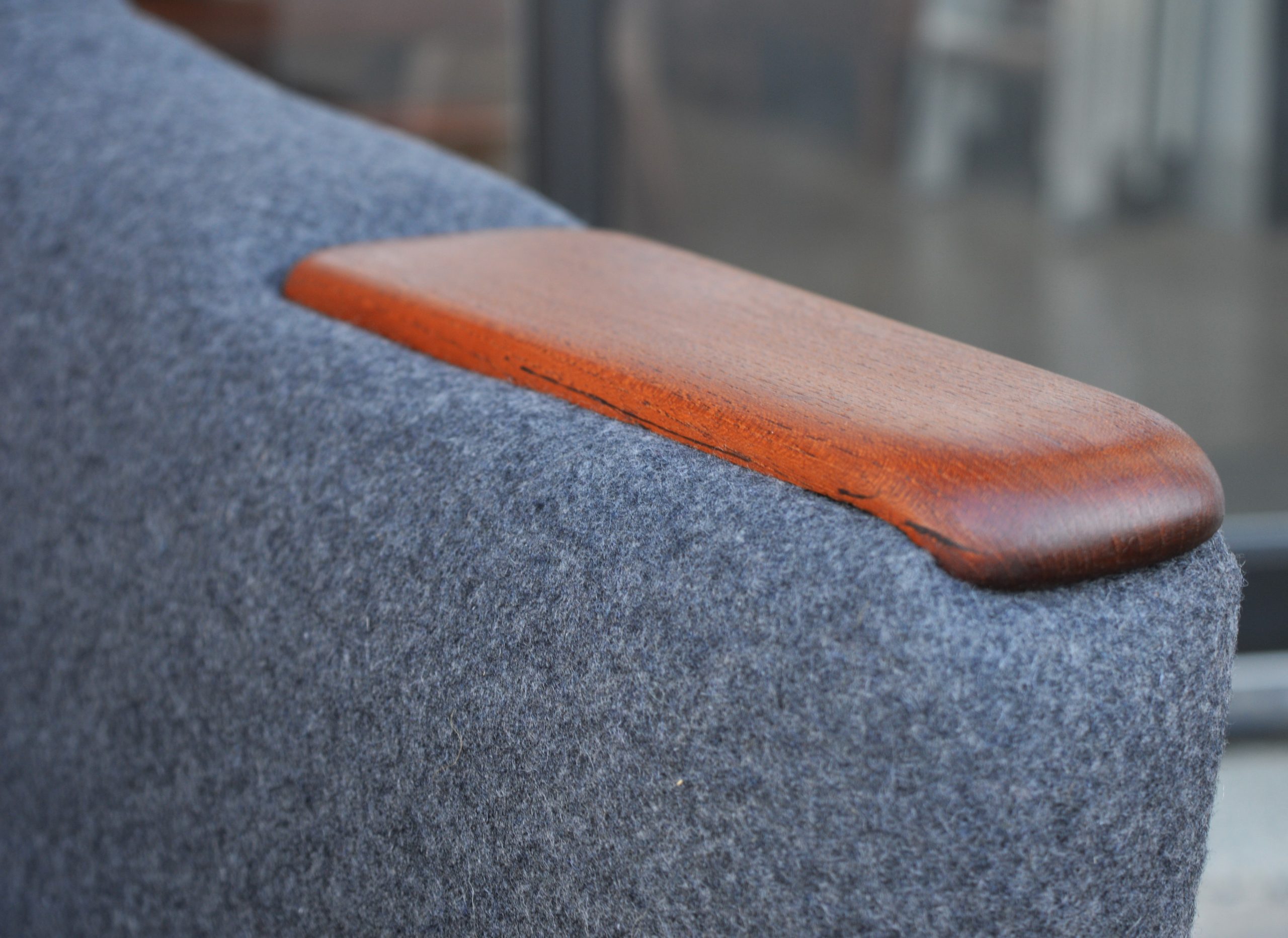 This spectacular and oh so comfortable Norwegian lounge chair has been restored from top to bottom. Featuring contoured teak armrests and matching base, sculptural lines and a floating weighted head pillow with leather straps. We’ve paired it with the perfect ottoman with teak legs and handles – in the original orange wool that is a perfect complement to the chair. If you wish it to be reupholstered to match the chair – please add $150. The chair has all new strapping, quality foam and a gorgeous Melton felted gray wool and all wood elements have been restored and freshly oiled. Dimensions – lounge chair: 30.5″W x 35″D x 17″H(seat)/39″H(top); ottoman: 22.75″W x 14.5″D x 15.25″H.