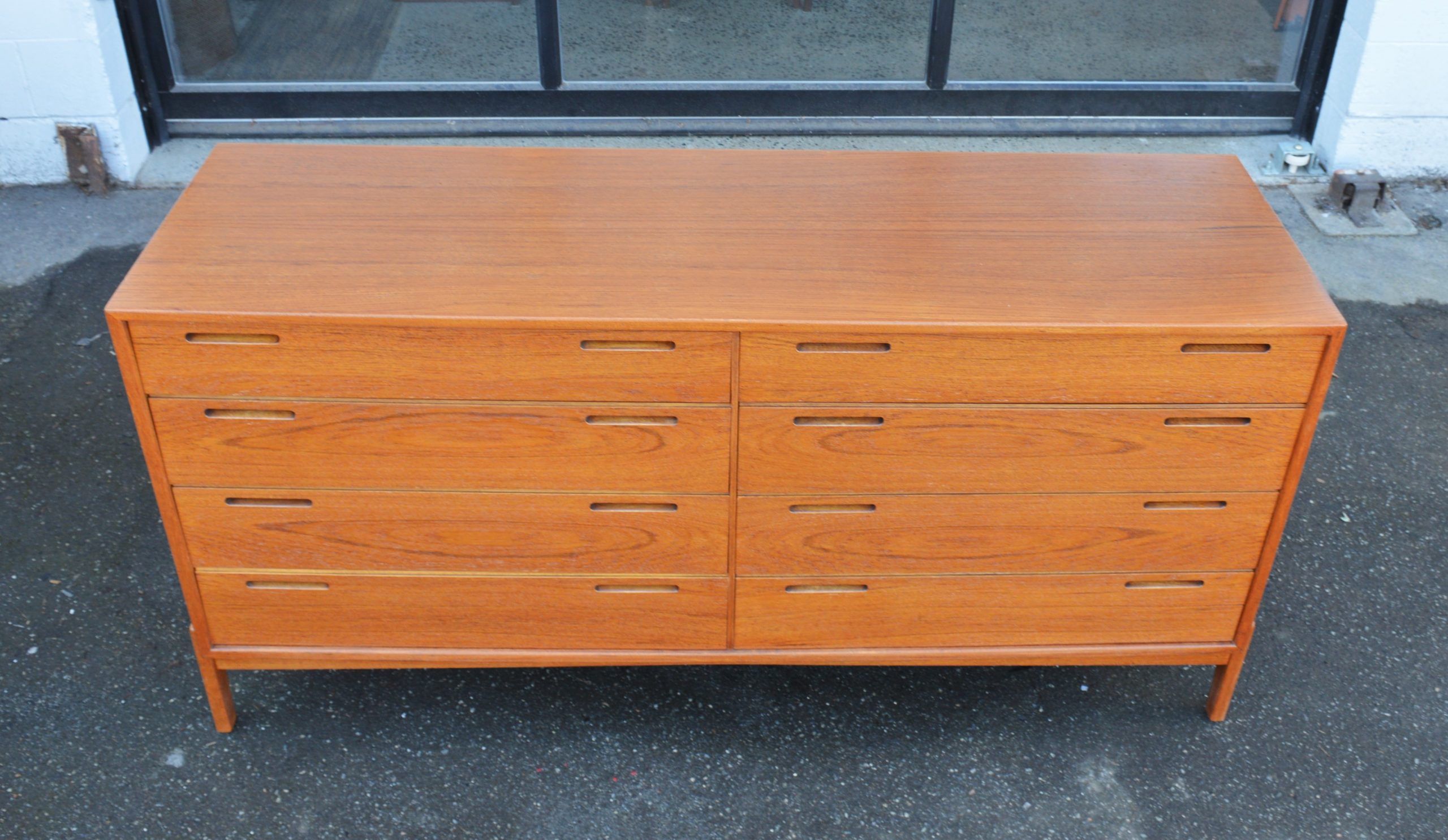 This gorgeous quality all wood dresser was designed by William Watting, Denmark, in the 1960s.  Featuring graduated drawer sizes perfect for all your storage needs (the top two are slimmest, then two medium, and 4 large).  Drawer frame construction is beech with dovetail joints and drawer glides.  Note the inset ovoid drawer pulls, and the cutaway at the top of each drawer to add visual interest.  Finally, the gorgeous sleigh base and beautifully finished back.  In gorgeous restored condition.  Dimensions:  59″W x 17.75″D x 31″H.