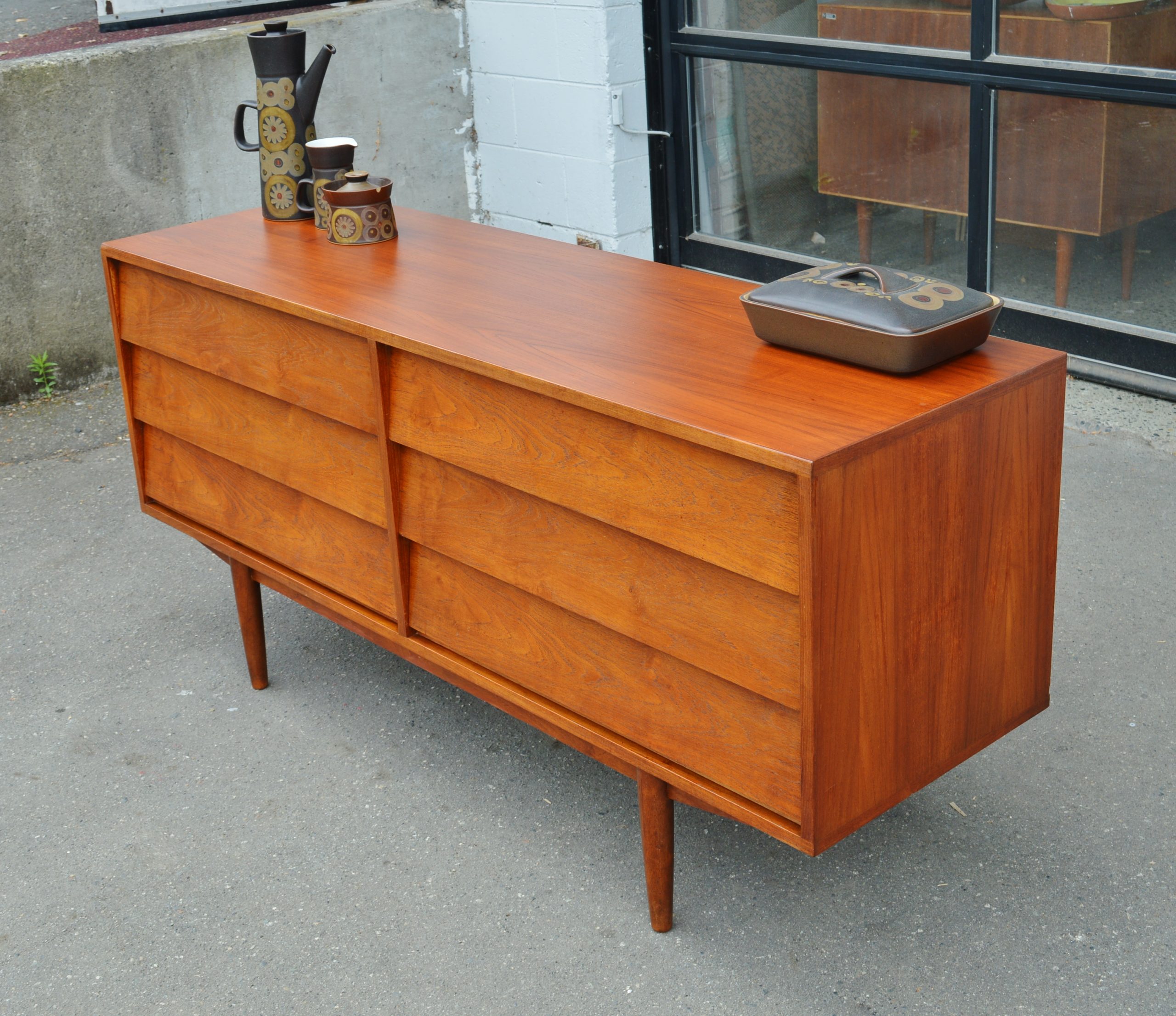 This gorgeous Danish modern teak dresser is quality, all wood construction.  Featuring 6 generous drawers with louver drawer fronts (angled), wood drawer frame construction and dovetail joints.  Finished with classic tapering conical legs and in gorgeous restored condition with a wonderful patina.  Dimensions:  60″W x 18″D x 28.75″H.