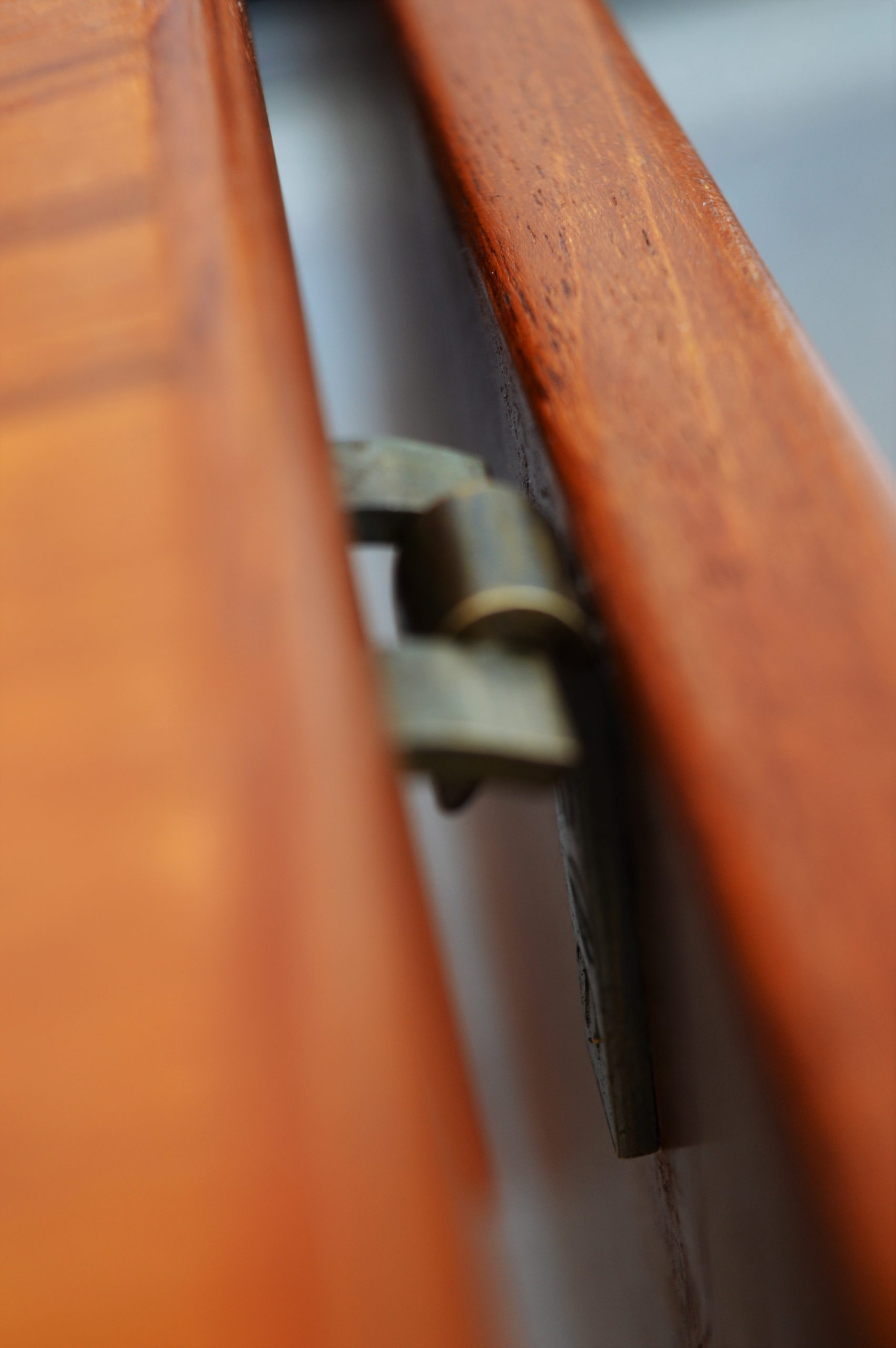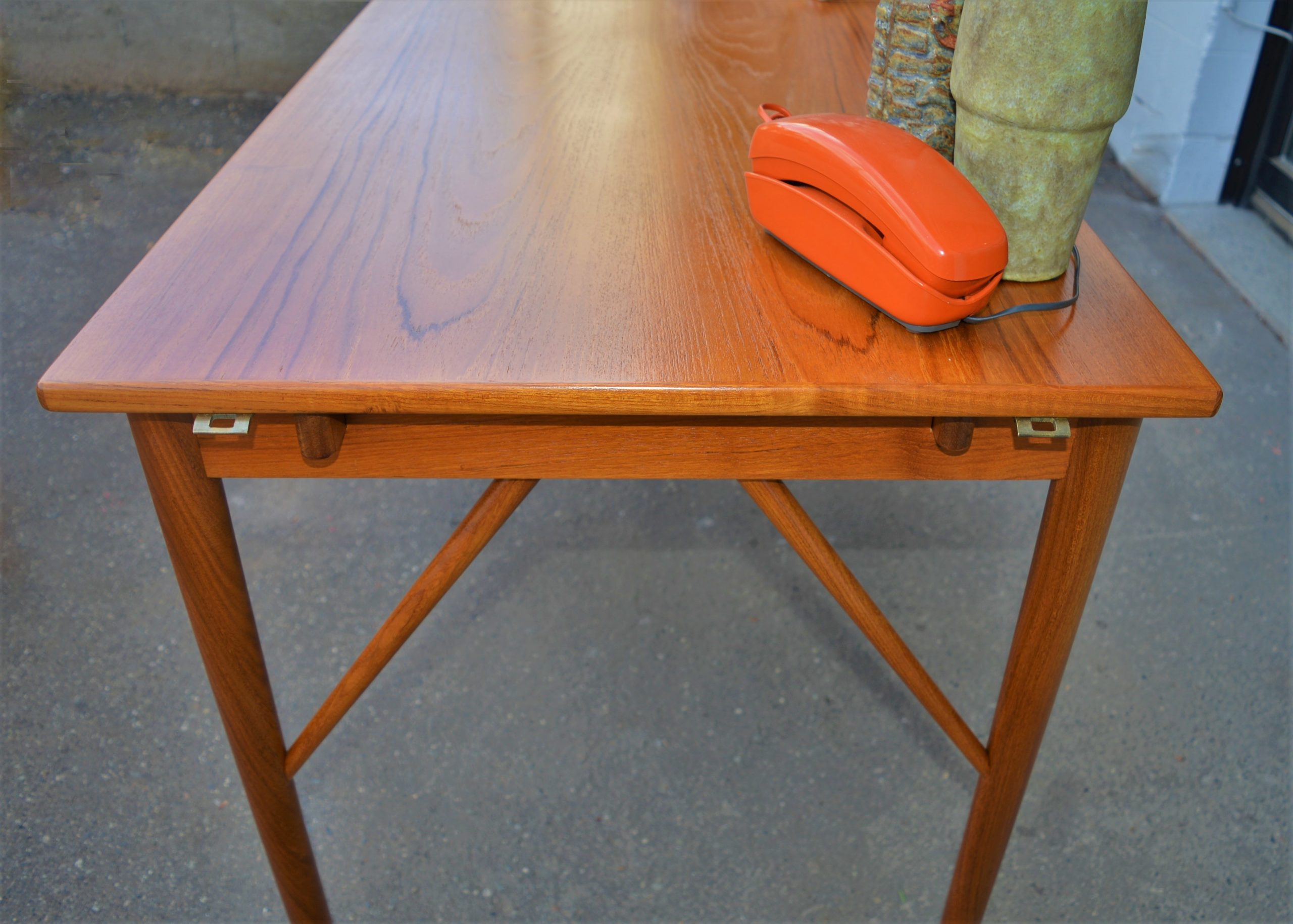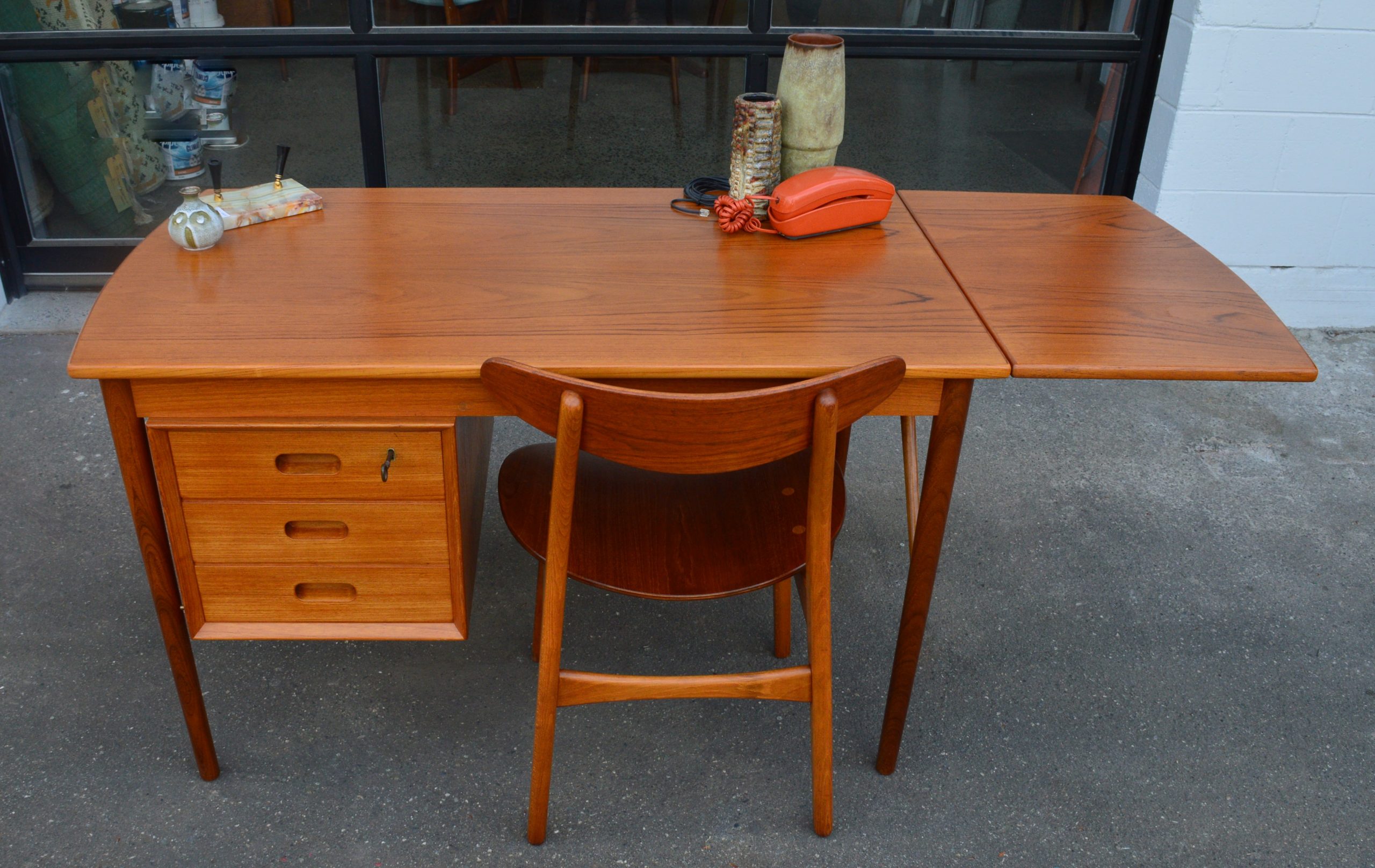 This stunning Danish Modern teak top quality desk was designed by EW Bach for Oddense Maskinsnedkeri A-S in the 1960s. Featuring a darker toned edge trim and legs, and a rich patina throughout. The front features a bank of 3 drawers with a mitered front edge to the drawer box, with each drawer having a solid teak drawer front with a cut-away sculptural drawer pull, birch drawer frame construction with dovetail joins – and the top one locks with a skeleton key. The right side has gorgeous sculptural wishbone braces from the legs to the desktop, and brass brackets from which hangs the drop leaf. To extend the leaf, raise it and pull out the two supporting beams from under the desk top. The back is a beautifully finished as the entire piece, with an open display shelf with the same mitered edge molding detail as the front. Finally, note how the left side of the desk top is curved, and when the leaf is raised, the grain runs continuously across the desk top and leaf, and the leaf has the same curved end. Additionally, since the leaf is supported on brass hooks, it may also be removed when not in use. In spectacular condition and a super practical design. Note the Danish Quality Control medallion in the top drawer.  Dimensions: 25.75″D x x 29.25″H x 47″L(leaf down)/64″L(leaf in use).