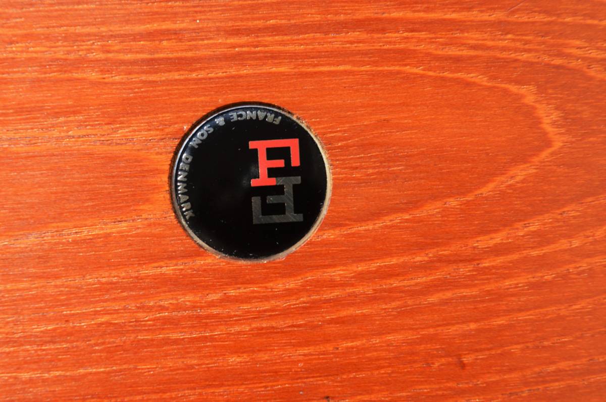 So rare, I’ve never seen a complete set in Vancouver! These delightful minimalist solid teak square tables were designed by Peter Hvidt & Orla Molgaard-Nielsen for France and Son in the 1960s. Featuring cut-away arced sides giving beautiful contouring, and tapering conical legs with a black metal disk on top (legs are removable for transport.) Branded and with the original France and Son metal medallions underneath, these practical tables can live in a striking spider leg cascading stack and pull them out as needed for guests, spread them around the room, or place them together in a square or a rectangle to also double as a coffee table! How awesome is that? Totally restored and in stellar condition.