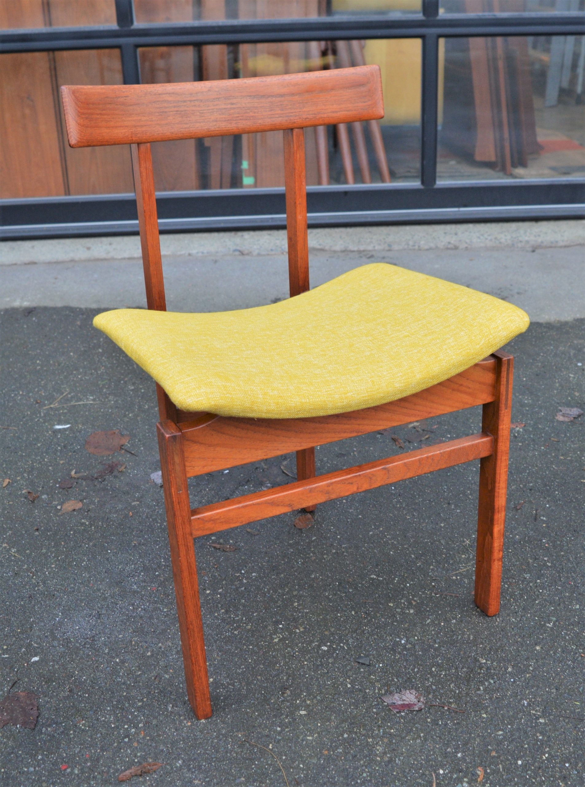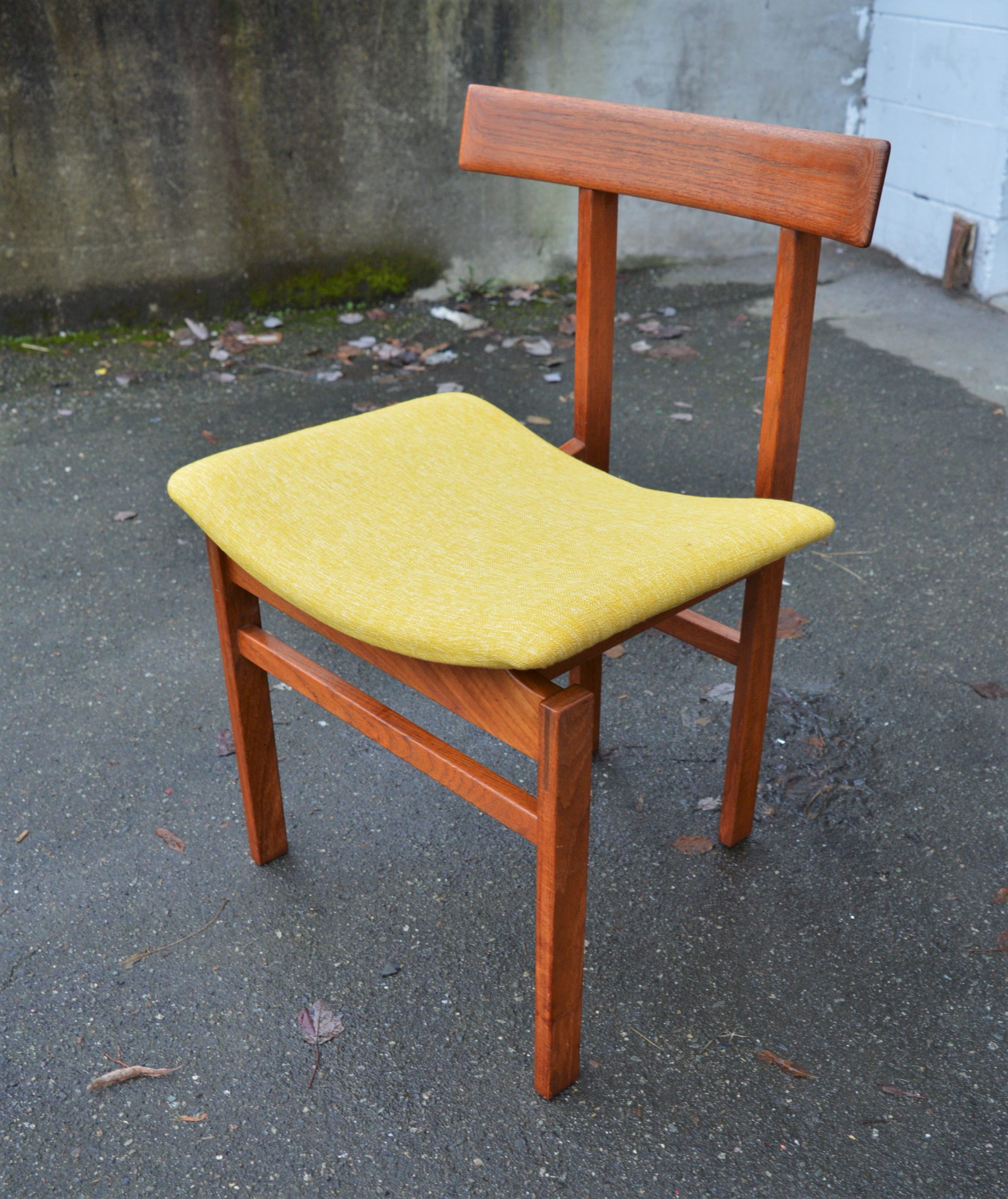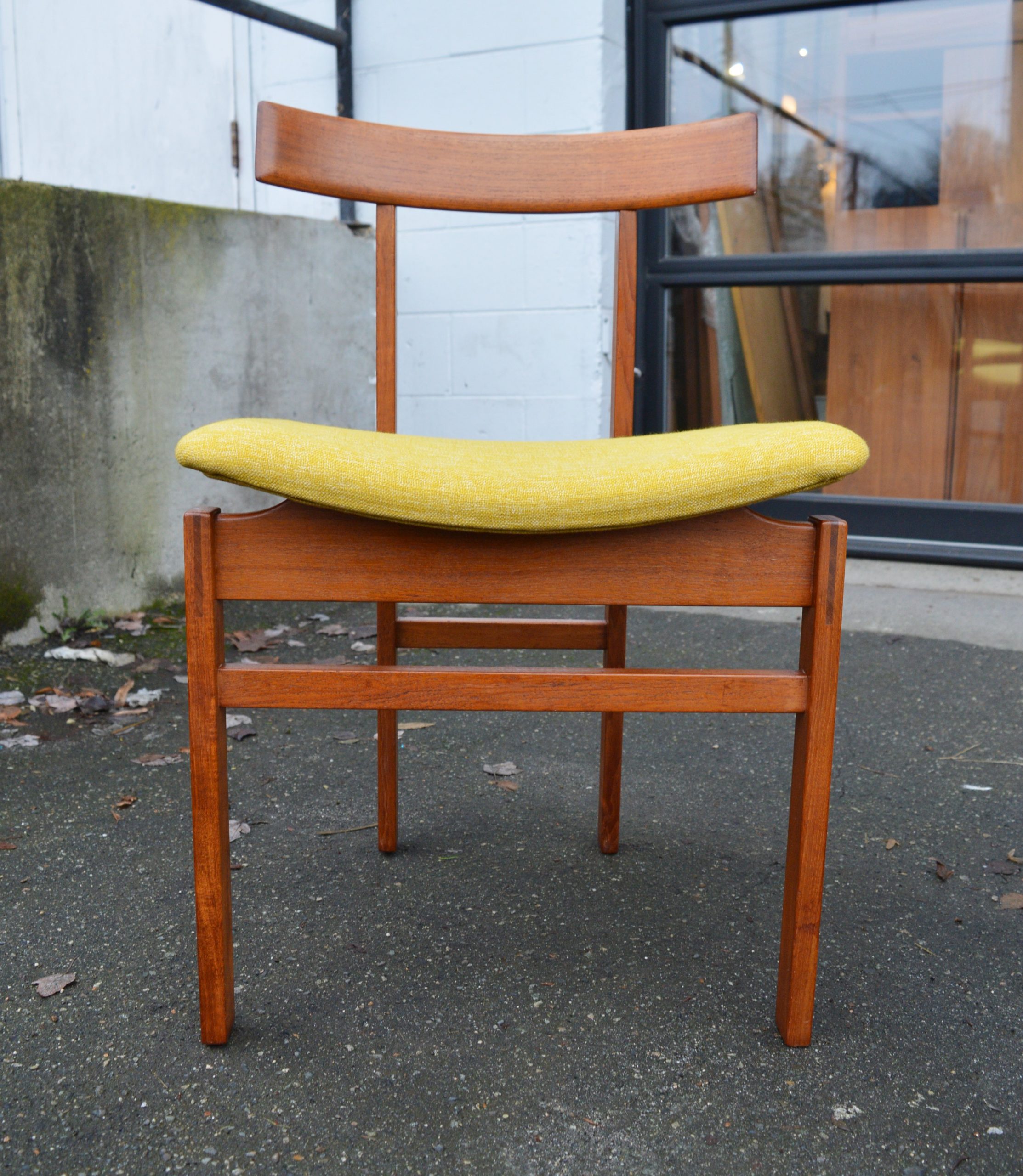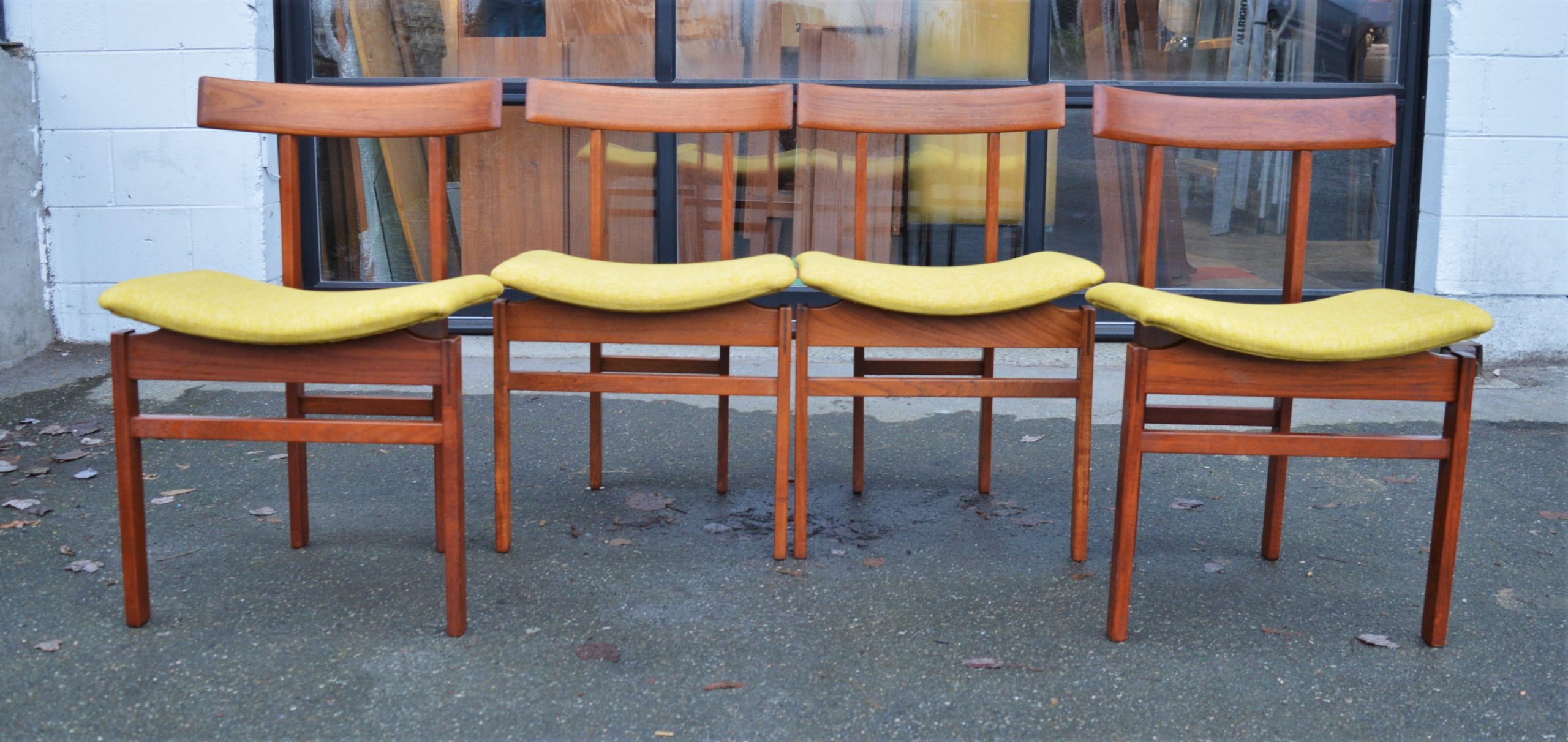 These gorgeous Danish modern teak dining chairs were designed by Inger Klingenberg for France & Son in the 1960s. Feature amazing, cubist, architectural lines. The curved back rest is echoed by the extreme curved seat which is so curved, it needs to be upholstered on the bottom as well as the top. Note also the finger jointed detail on the front legs and they retain the France & Son metal medallions. In stellar restored condition with new foam and a lovely yellow tweed upholstery. PLEASE NOTE OUR POLICY: if you purchase a set of dining chairs with a dining table, we deduct 10% off the cost of the chairs. Price is for the set of 4 chairs.