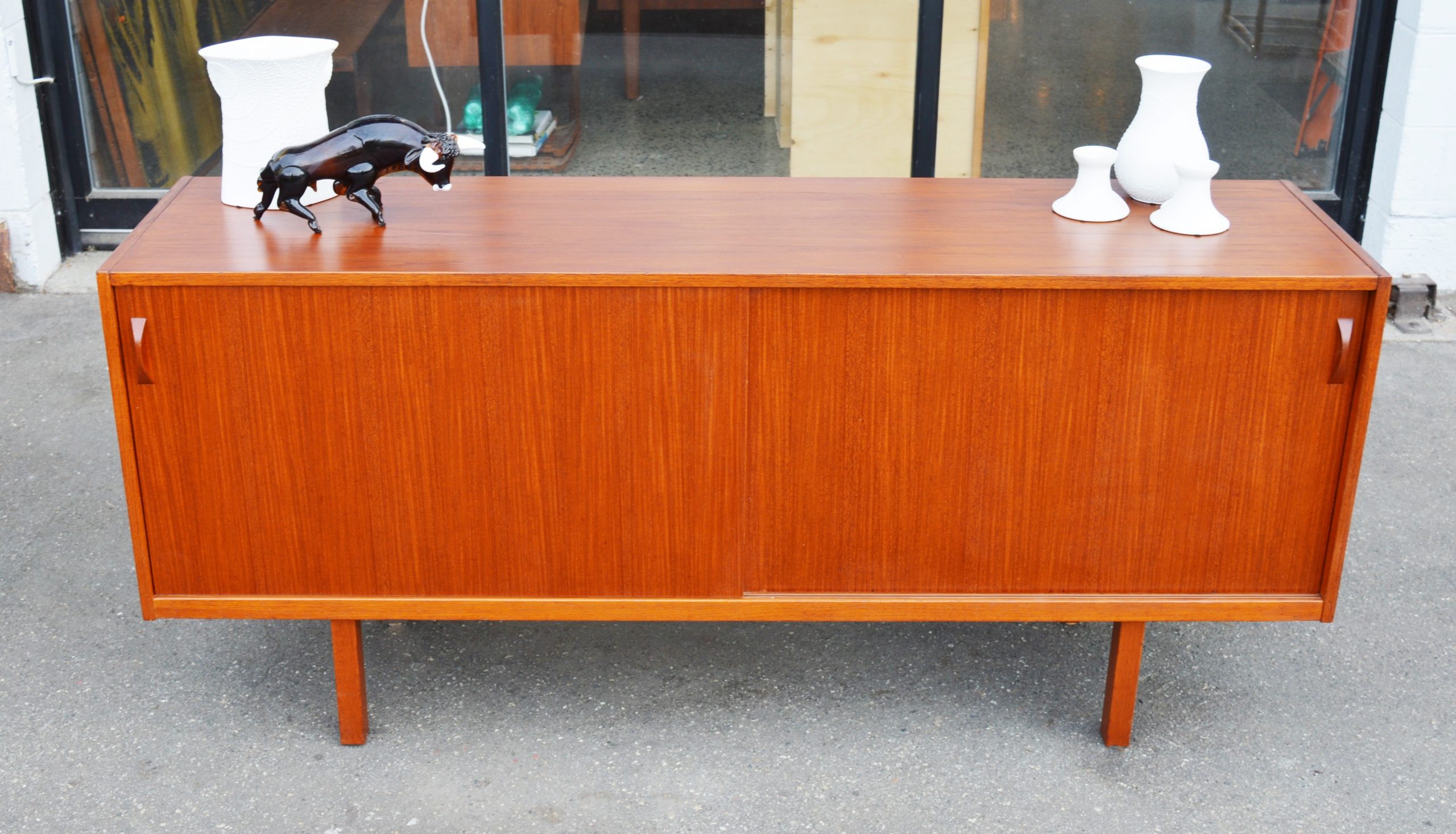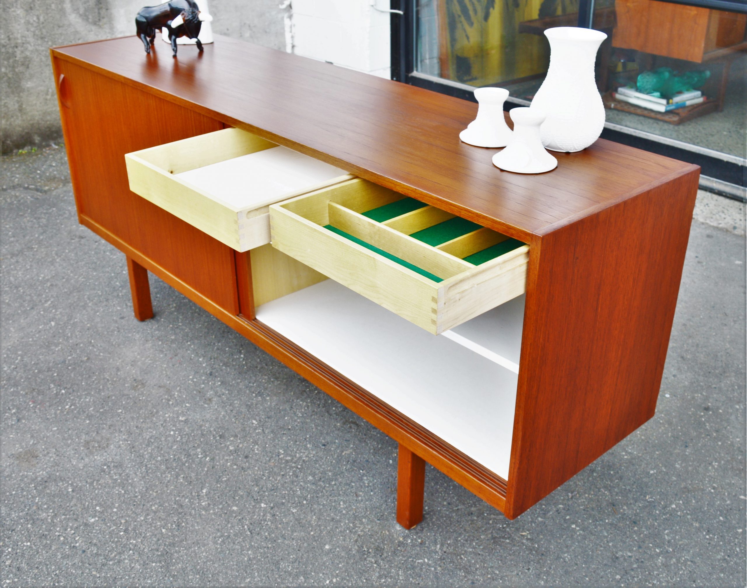 This gorgeous rich toned teak sideboard / buffet was made by Troeds, Sweden, with their traditional white interior. Featuring two sliders with pretty carved pulls, which open to reveal two adjustable shelves and 2 side by side solid beech drawers with finger jointed corners and one is segmented and felted. Finished with a sturdy base that echoes the cubic clean lines of the cabinet. In wonderful restored condition. Dimensions: 63.75″W x 16.5″D x 28.25″H.