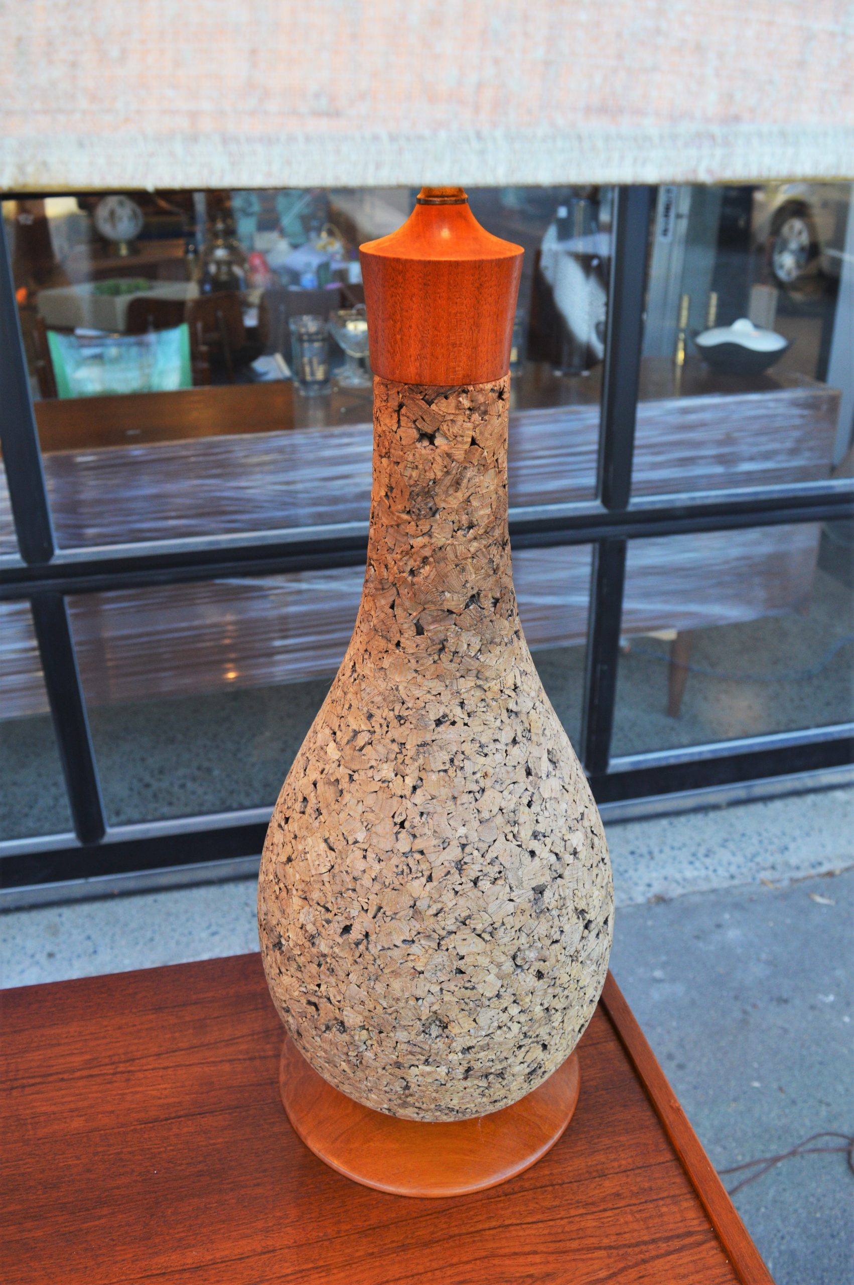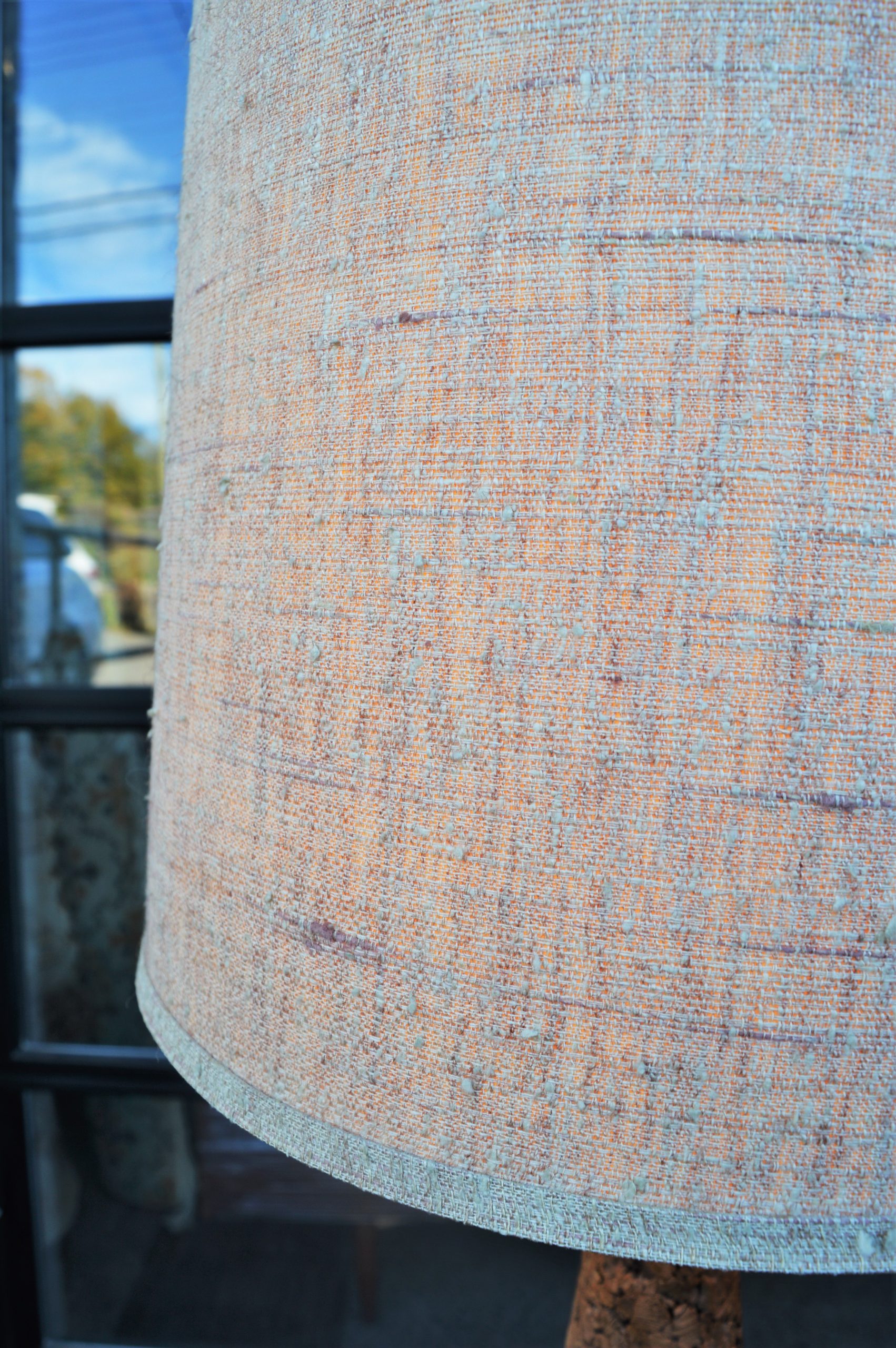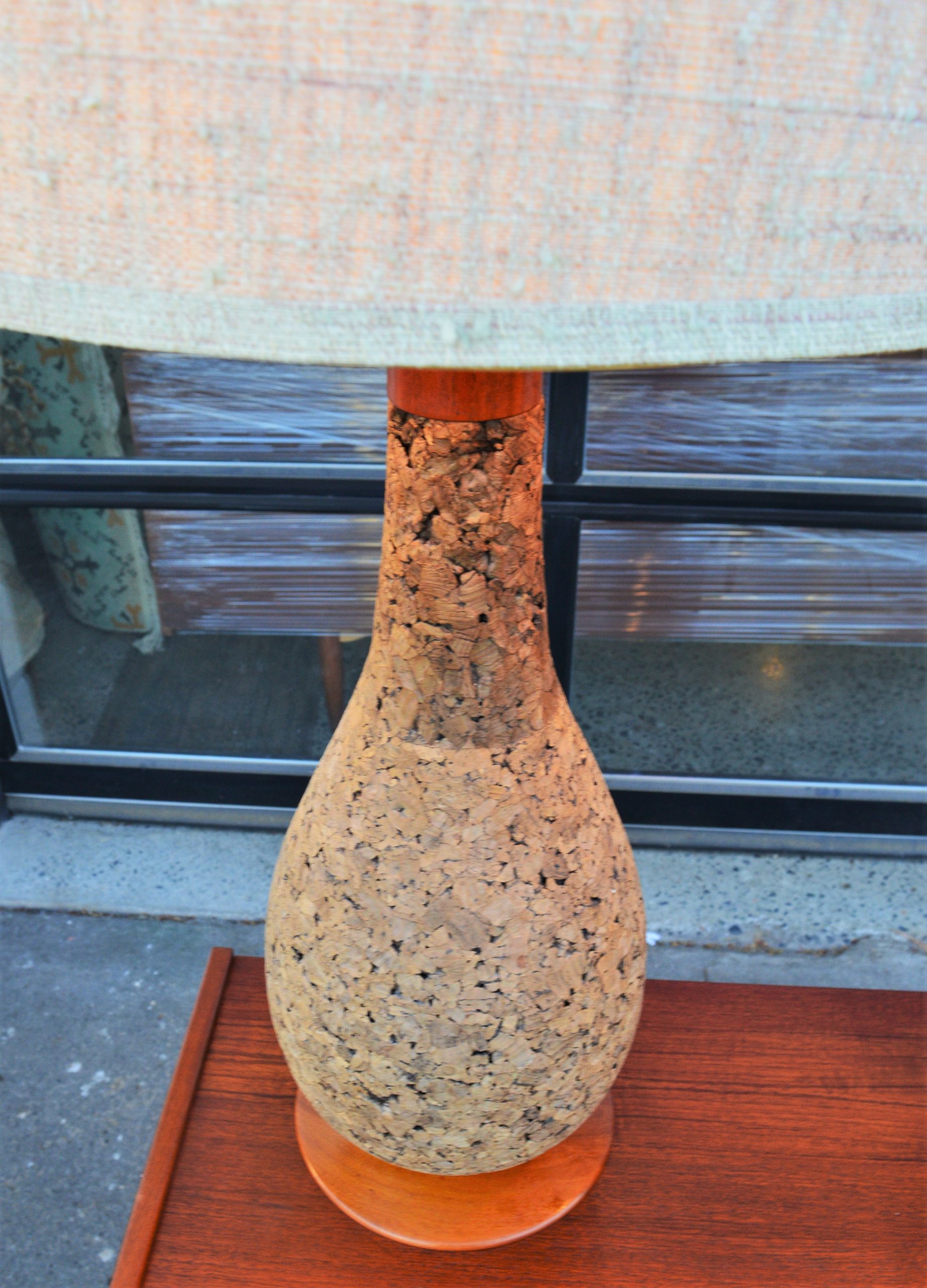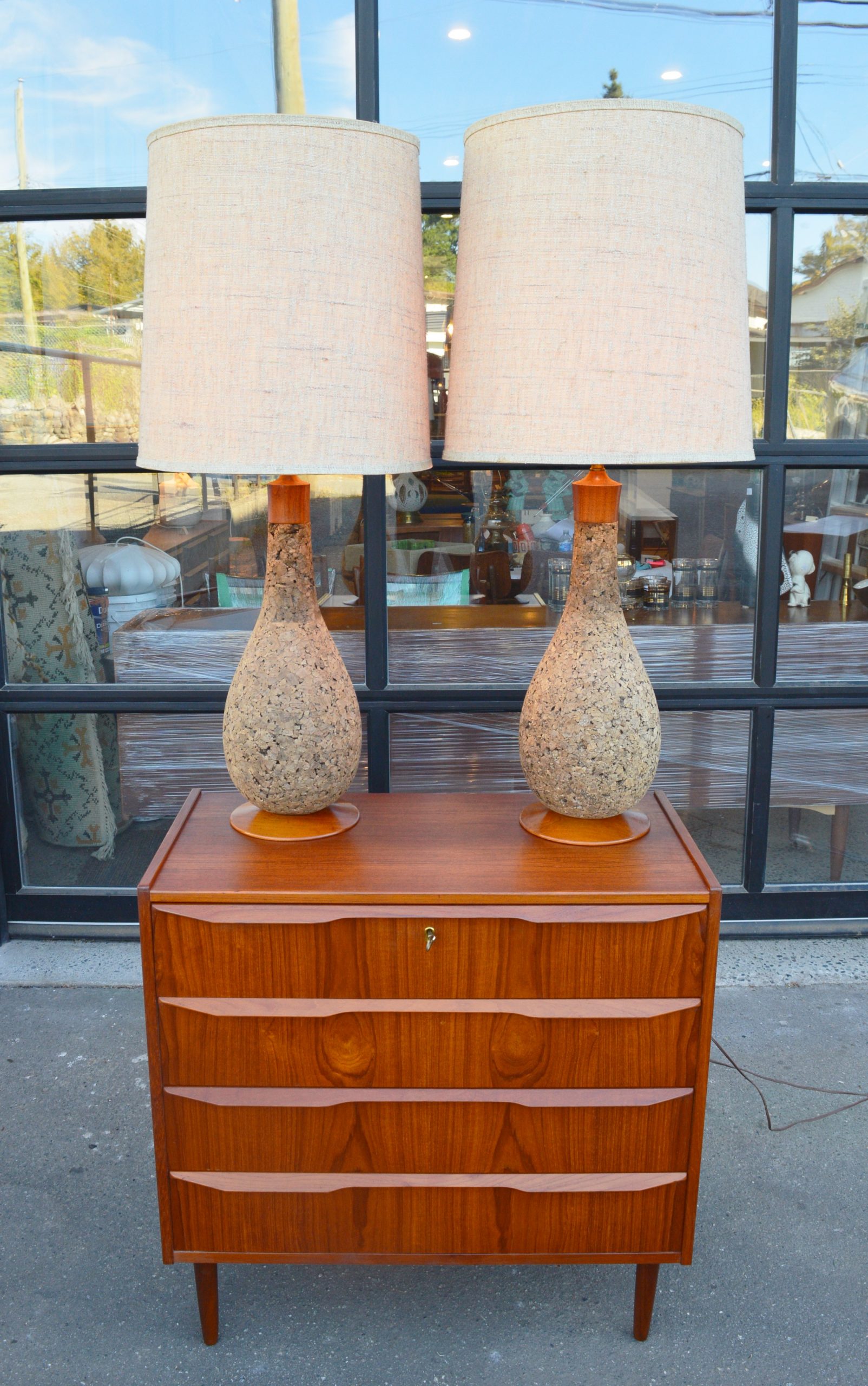 These wonderful 2 tone cork lamps with disc teak base and sculptural teak lamp are in amazing condition – and have the amazing original textured linen barrel shades.  They take a regular base 3 way / trilight bulb and are wired for North American standards with a 2 prong plug.  Dimensions: 15″ diameter x 39.5″ high (the base until just below the socket measures 22″ high).