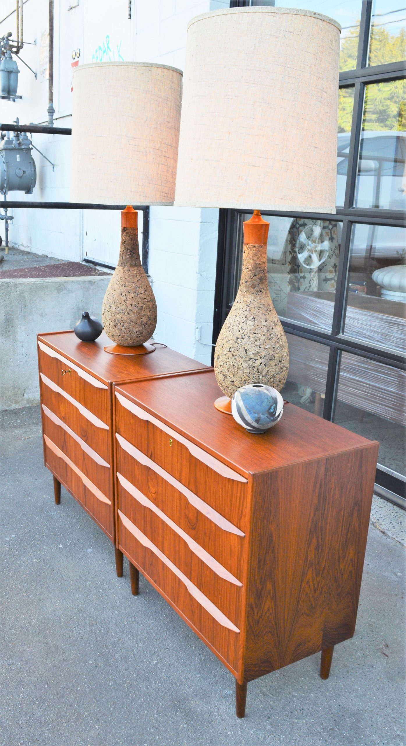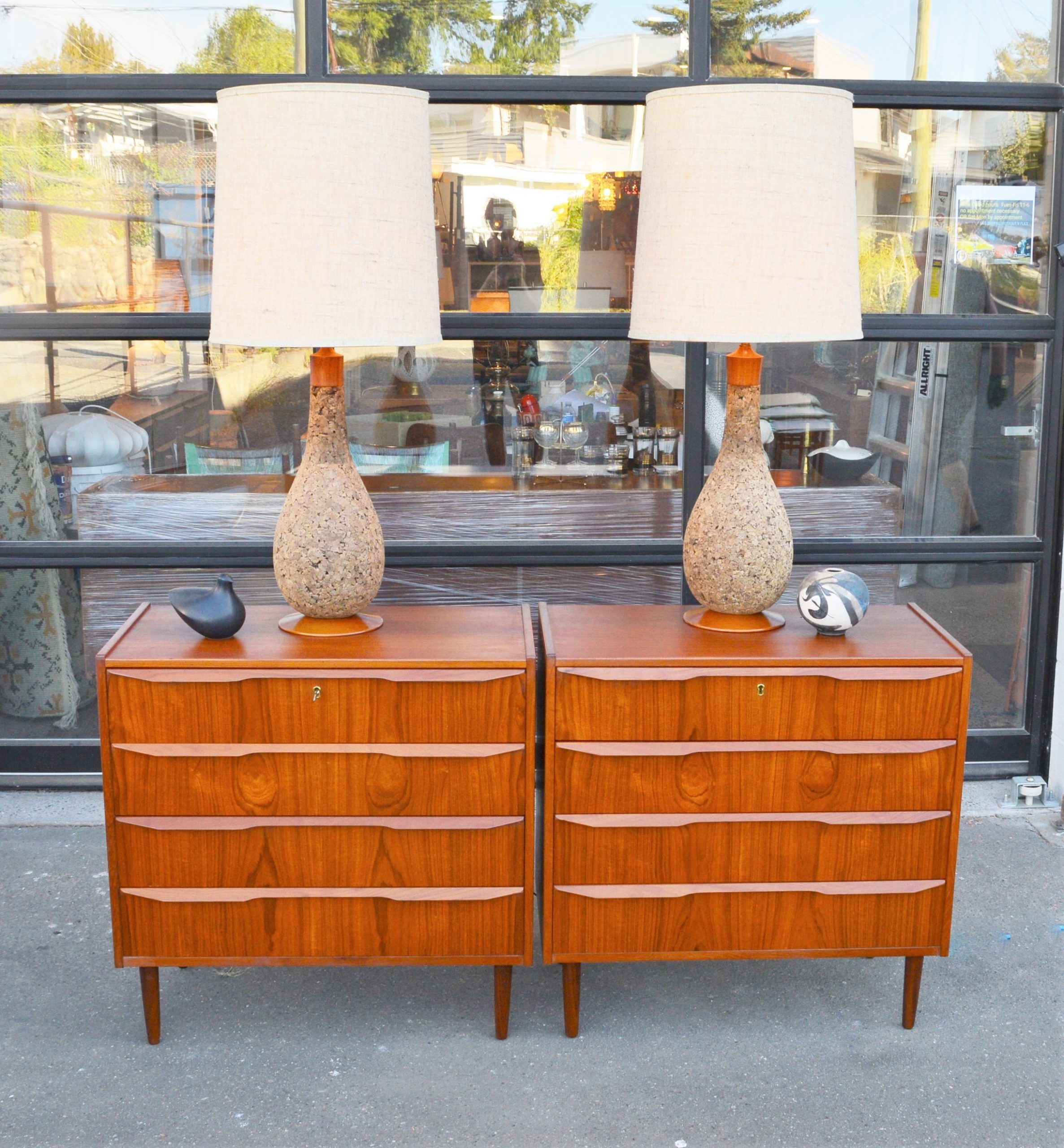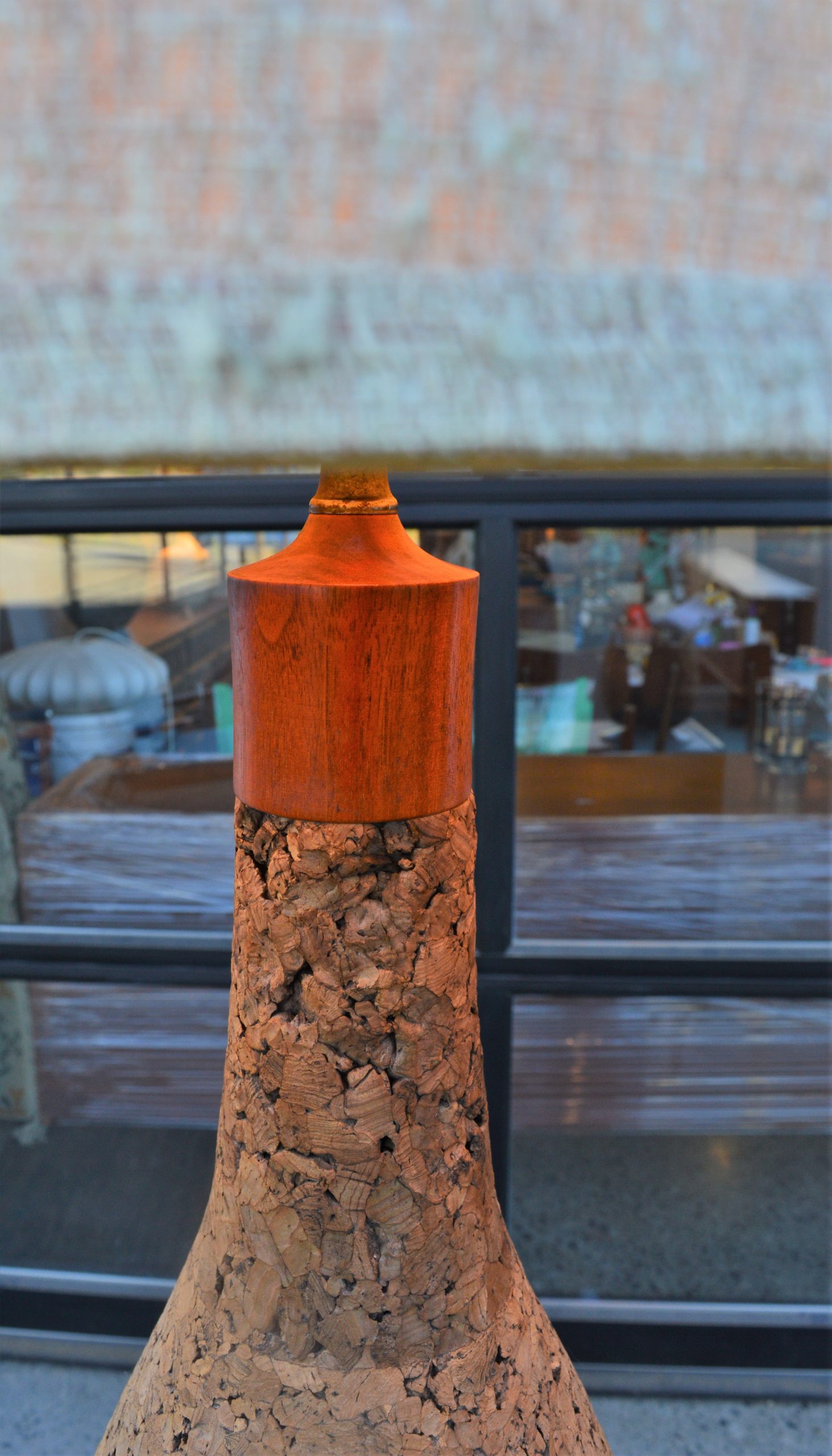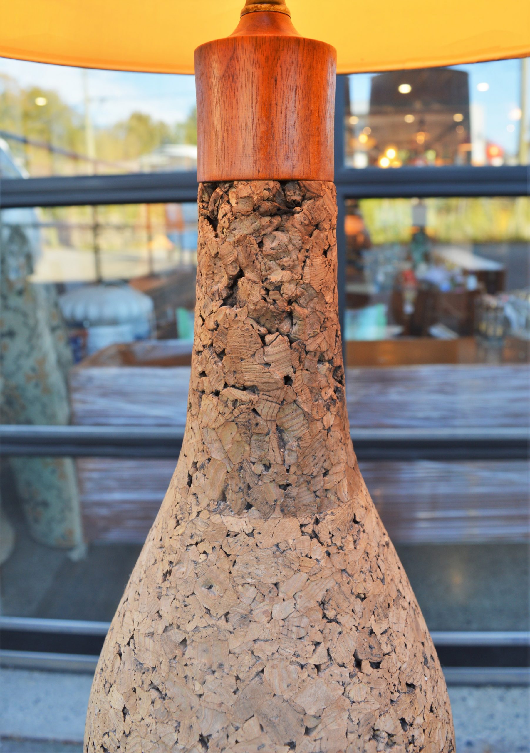 These wonderful 2 tone cork lamps with disc teak base and sculptural teak lamp are in amazing condition – and have the amazing original textured linen barrel shades.  They take a regular base 3 way / trilight bulb and are wired for North American standards with a 2 prong plug.  Dimensions: 15″ diameter x 39.5″ high (the base until just below the socket measures 22″ high).