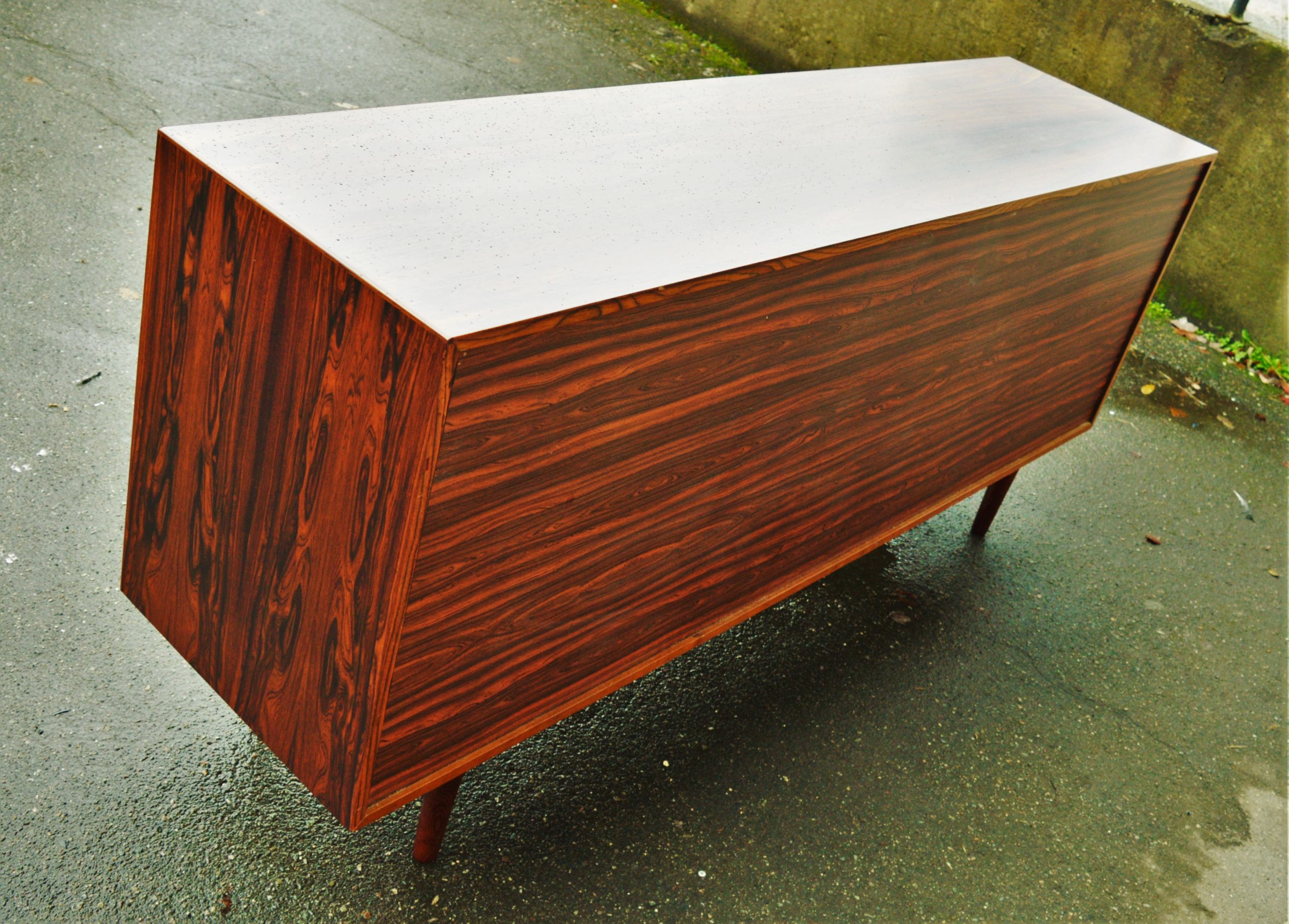 This absolutely stunning Danish Modern rosewood generous 8 drawer dresser was made by Westnofa, Norway, in the 1960s. Featuring full length curved drawer pulls, all wood drawer construction with dovetail joints as well as dividers in the top two drawers. Finished with classic conical legs and it even has a finished back so can serve as a room divider. Restored and in beautiful condition. Dimensions: 71.5″W x 18.25″D x 32.25″H.