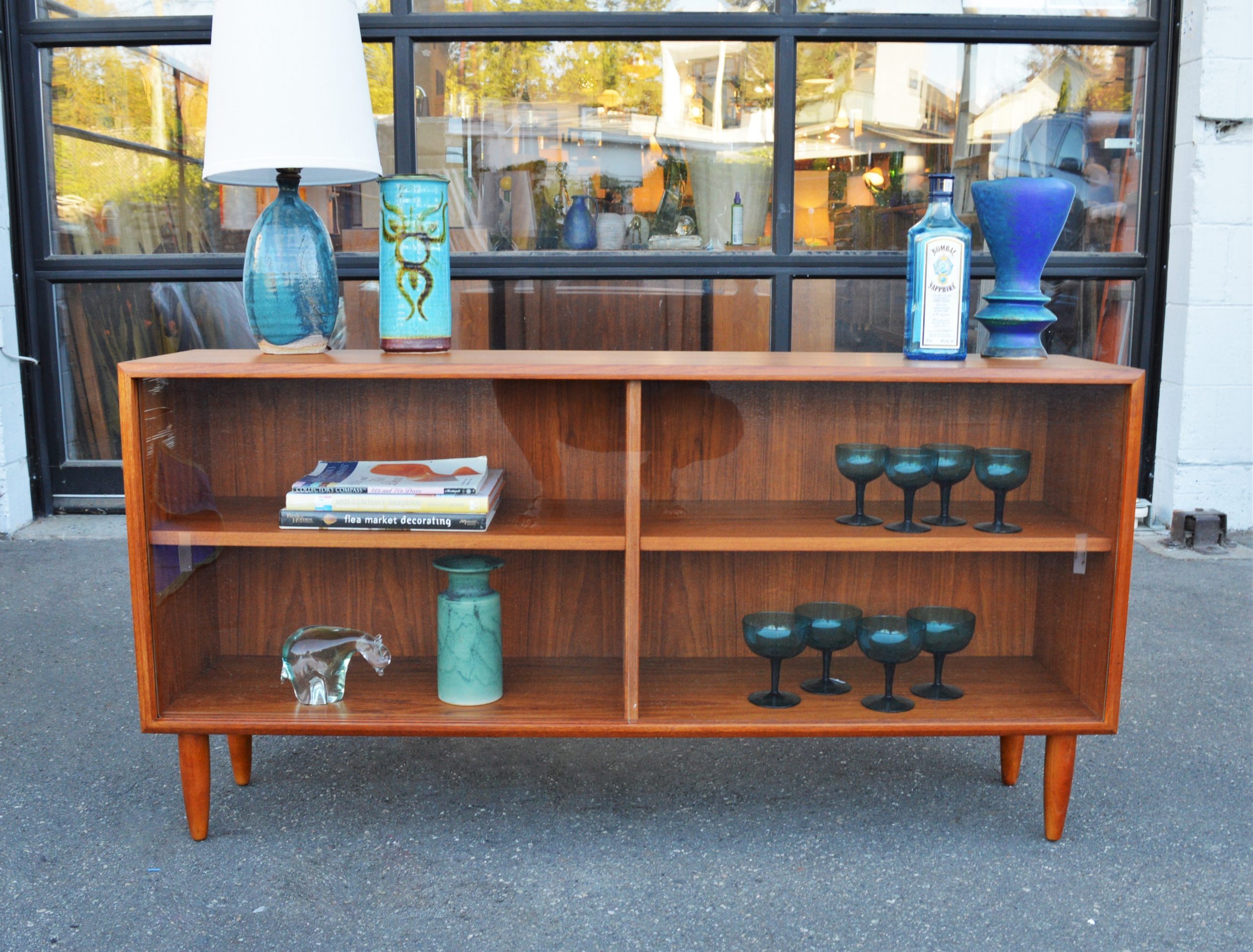 This lovely and compact Danish Modern teak cabinet is perfect for a wide screen TV stand, a display cabinet for your collectables or a bar. Featuring a nice compact footprint, a mitered front molding detail, 2 adjustable shelves and 2 glass sliders. In excellent restored condition. Dimensions: 48″W x 12″D x 24.5″H.