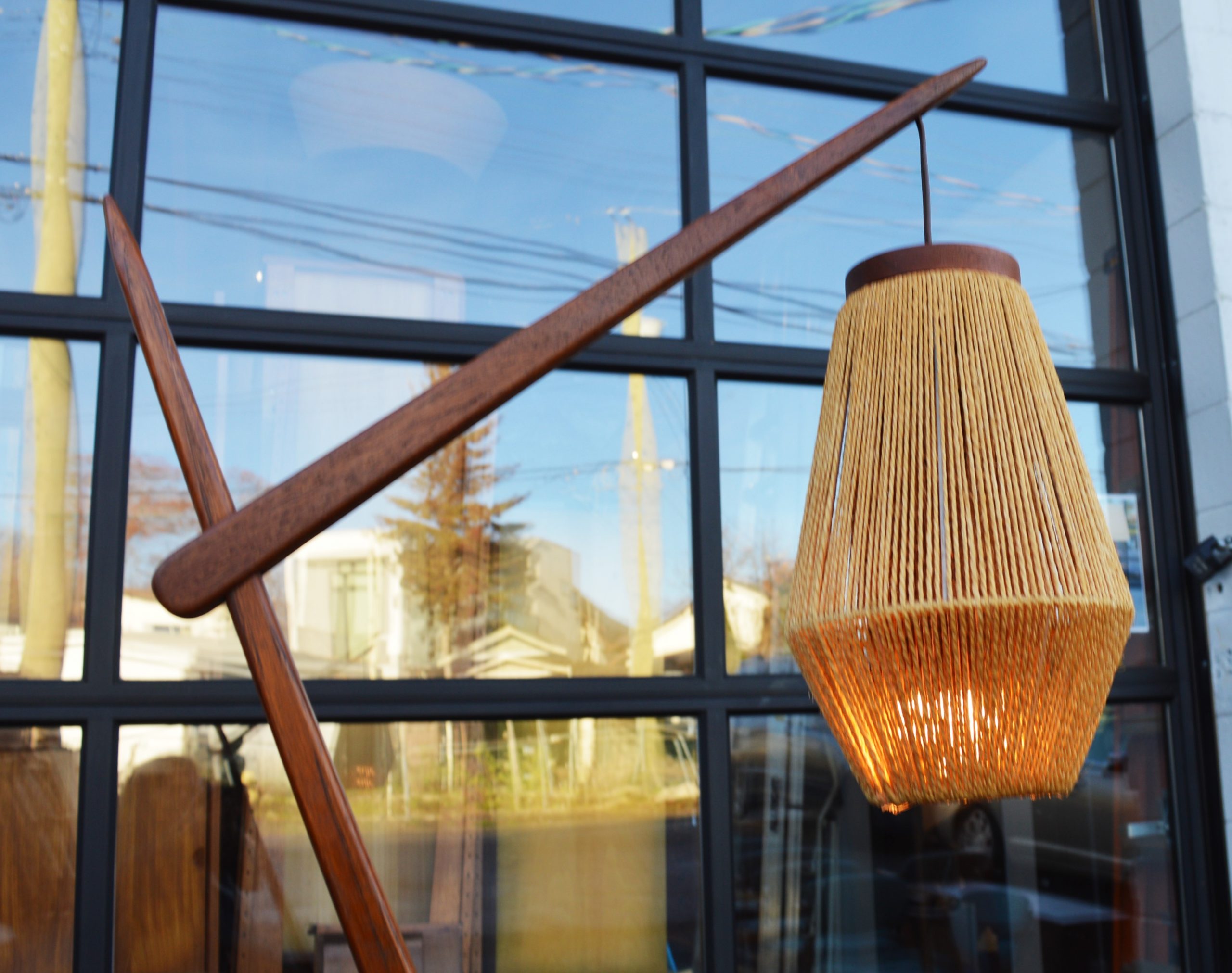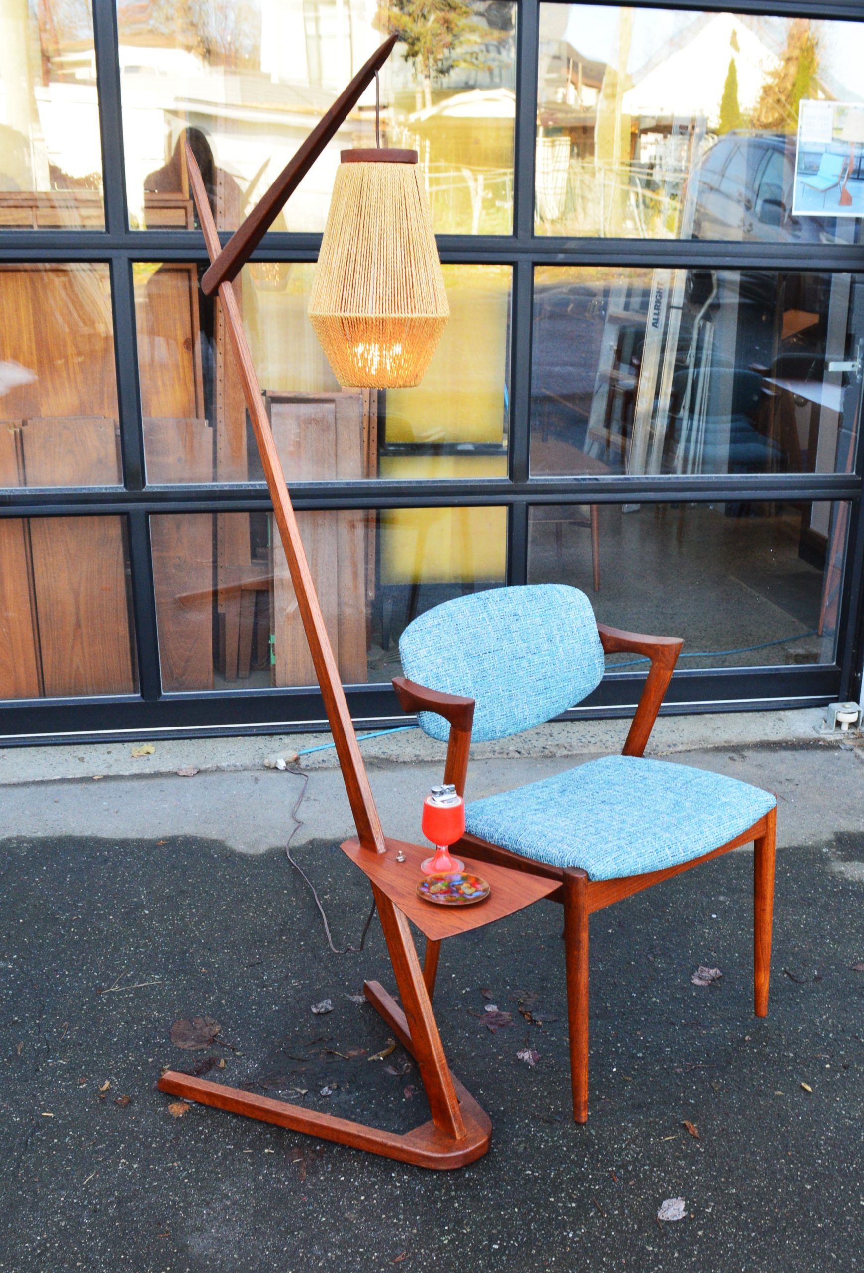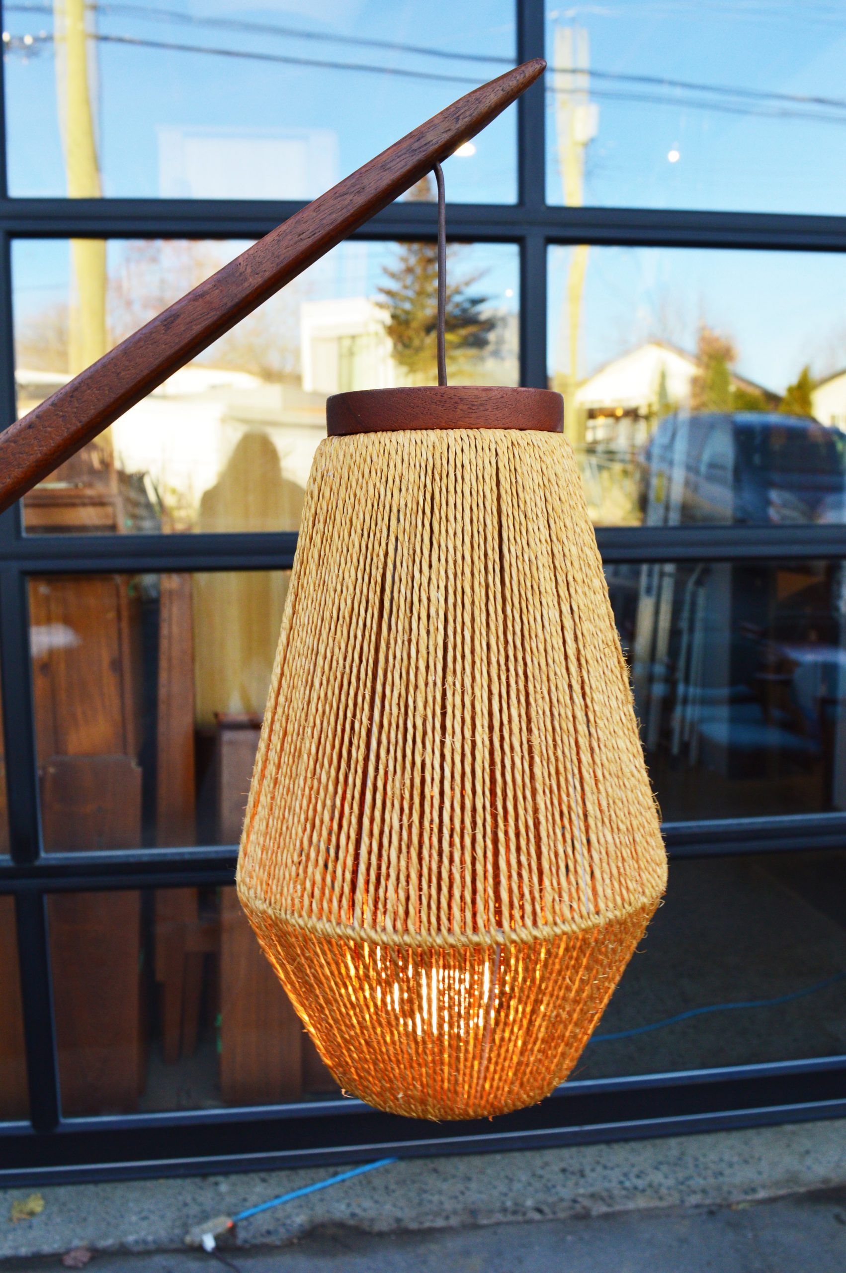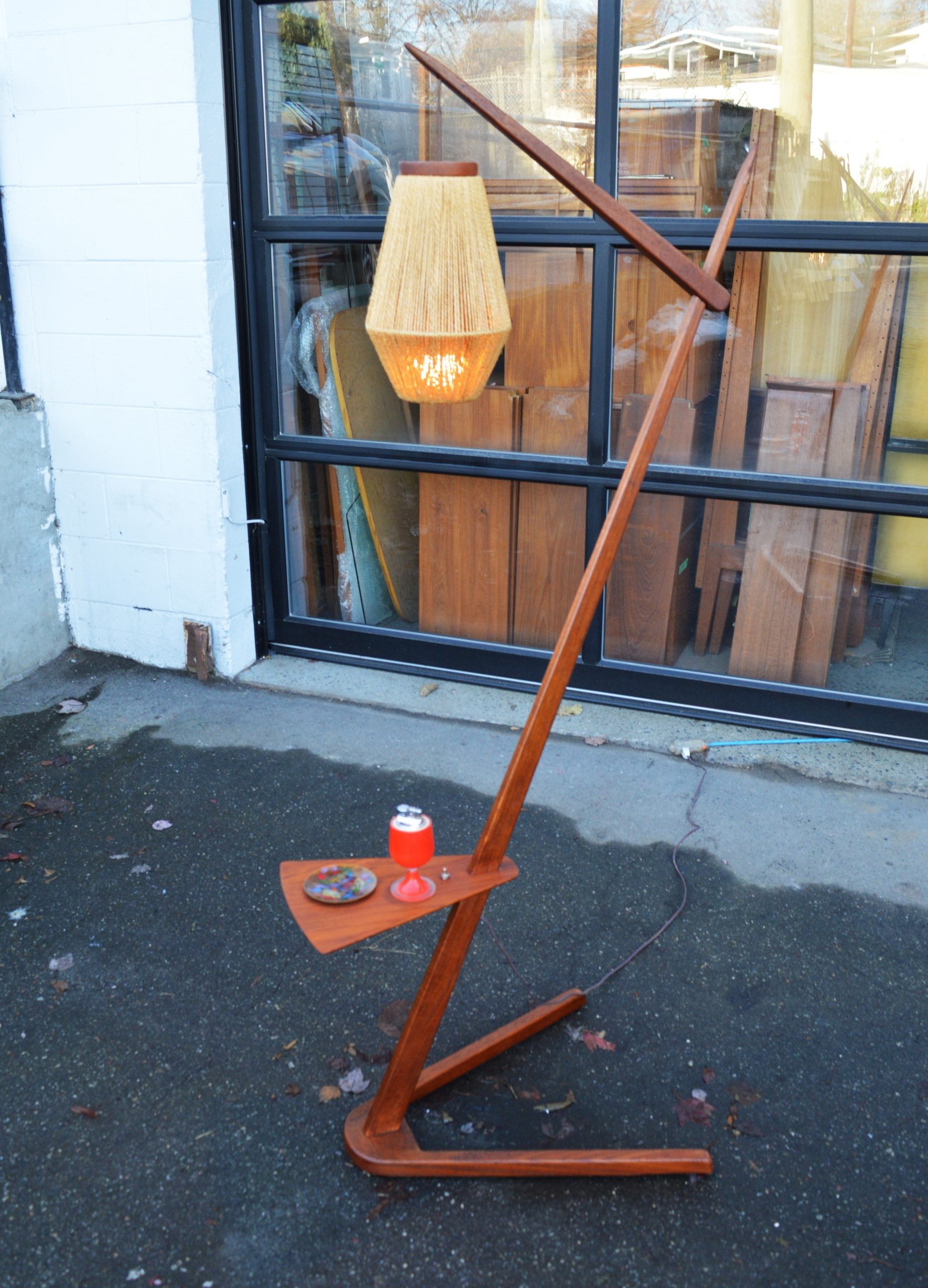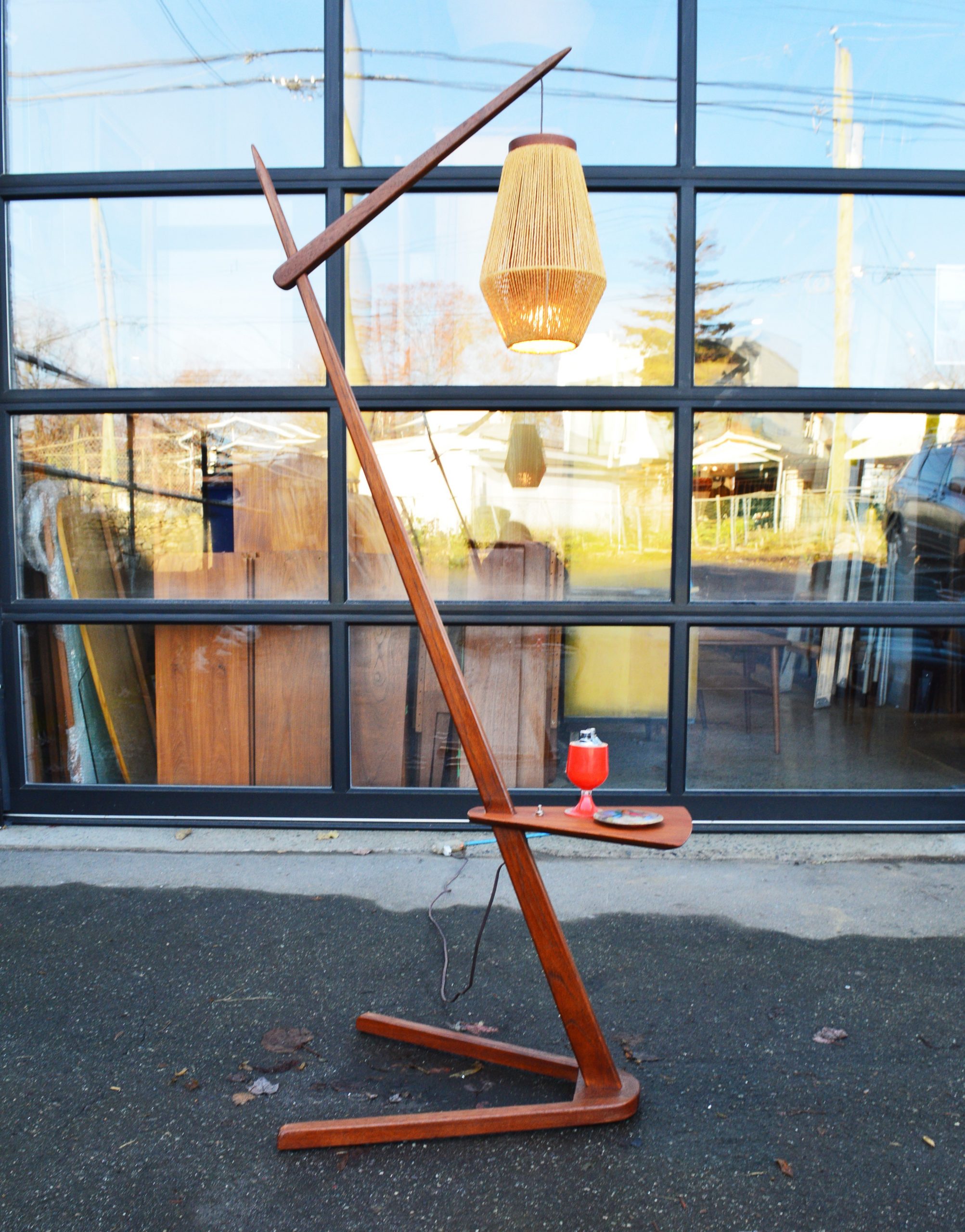Teak Cantilever Floor Lamp w/ Table & Jute Wrapped Shade