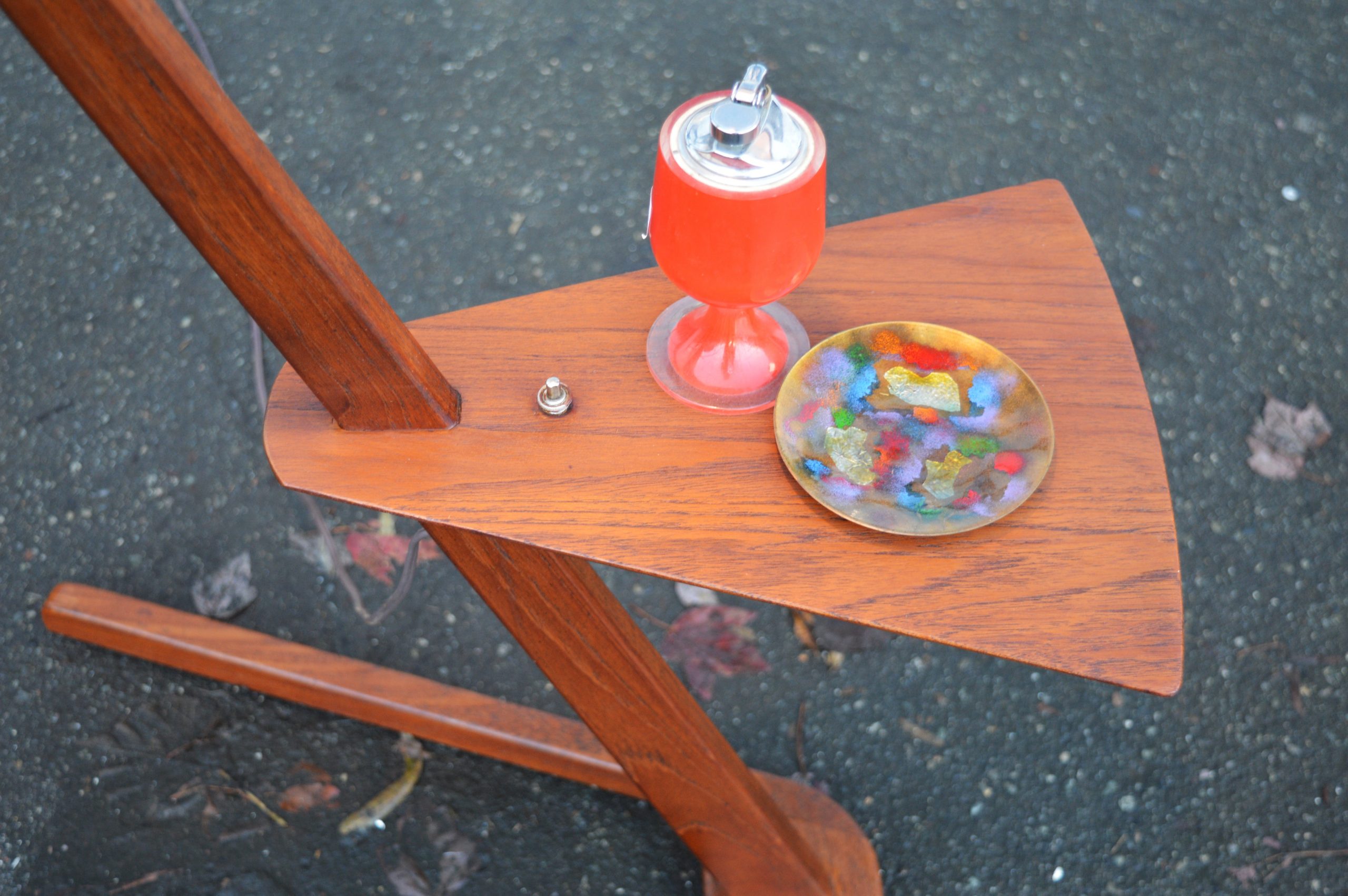 This amazing Danish Modern teak cantilever floor lamp is truly a scene stealer. The beautiful tapering architectural lines, the built-in triangular side table, and the perfect pairing with a jute wrapped shade with a teak cap – likely by Fog & Morup. In gorgeous restored condition. Dimensions: 19″W x 26.5″D x 16″H(table top)/63″H(top).