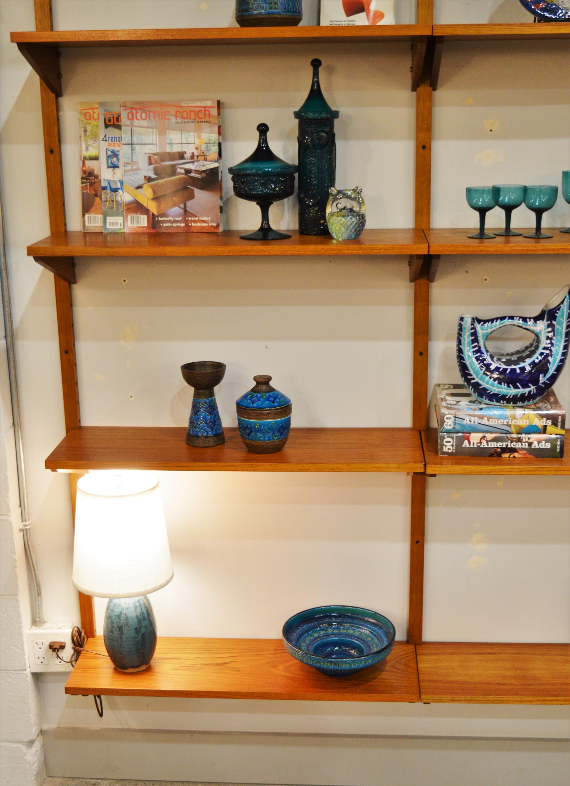 This gorgeous minimalist teak floating Cado style wall unit has 10 shelves with teak angled brackets – each held in place with two brass pins and a dowel on the top of each bracket.  Completely modular, you can place the shelves in any configuration – frame your widescreen TV or a favorite piece of art, or paint the wall behind it a feature color so everything on the shelves just pops against the color.  In excellent vintage condition.  Dimensions: overall width is 64.5″ with 8 x 10″D shelves and 2 x 8″D shelves.  The rails can be hung at any height and measure 75″L.
